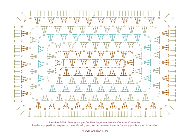 Como veréis el patrón no está completo porque se trata de ir repitiendo las filas hasta conseguir el ancho deseado, el número de filas dependerá del hilo que uséis, el ganchillo o si tendéis a apretar el punto.