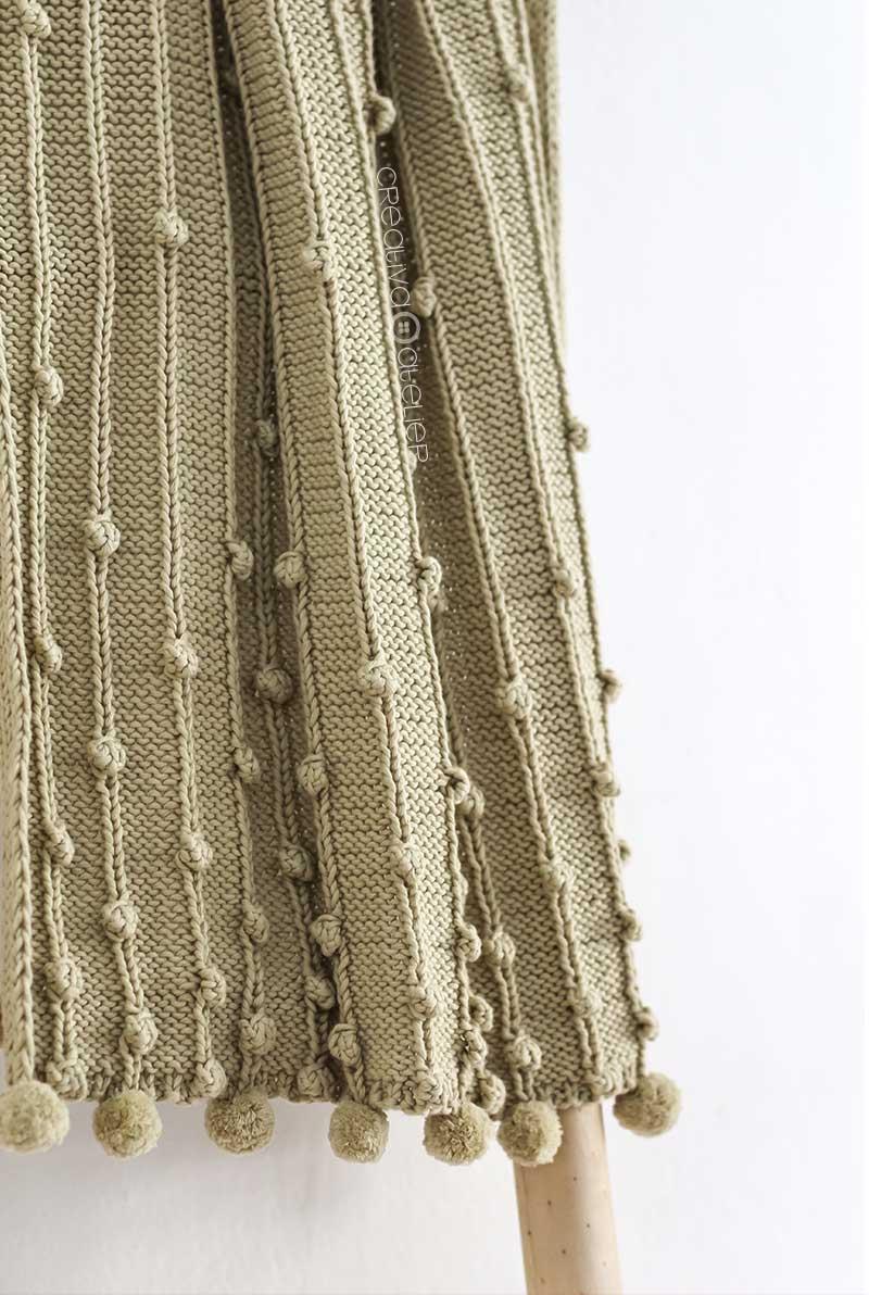 Para finalizar, corta todo el sobrante hasta obtener su forma redonda.Una vez finalizados los 10 pompones cóselos al bajo de la manta.