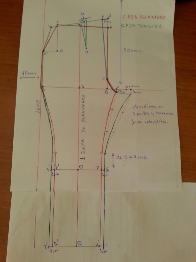 I= LÍNEA DE PLANCHADO.1/2 DE A-C. UNIMOS CON CINTURA ( H) Y BAJAMOS HACIA ABAJO.