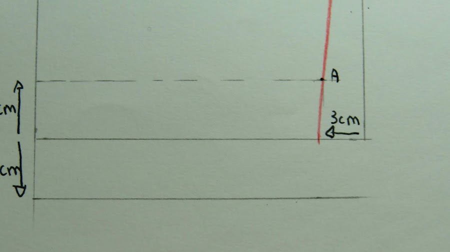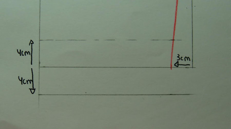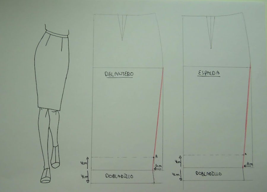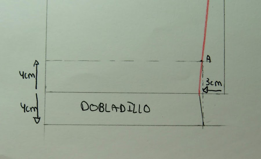 Hacemos una línea discontinua a 4 cm por encima de la línea del bajo de falda, para saber cómo dibujar nuestro dobladillo