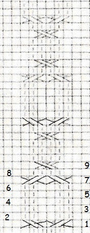Vuelta 9: *2 puntos derecho, 2 revés, 1 pto drcho, trenza de 4 ptos hacia la izda, 1 pto drcho, 2 revés*, repetir de * a *.