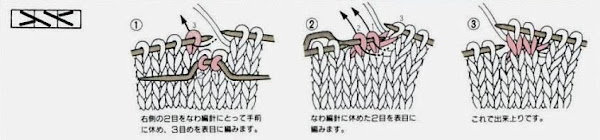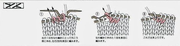 Vuelta 7: *2 puntos derecho, 2 revés, trenza de 3 ptos hacia la izda, trenza de 3 ptos hacia la drcha, 2 revés*, repetir de * a *.