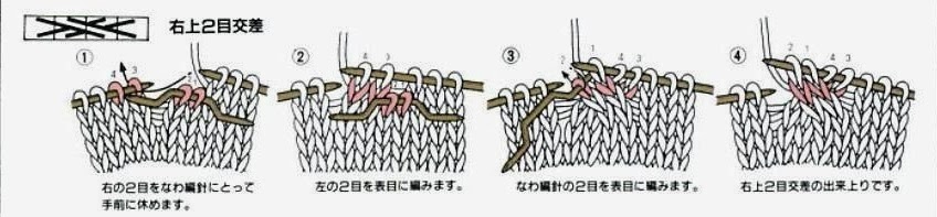 Ahora trabajaremos con 4 puntos: para que gire hacia la izda, ponemos 2 ptos en la aguja auxiliar hacia delante, tejemos los 2 siguientes, y después los 2 de la aguja auxiliar.