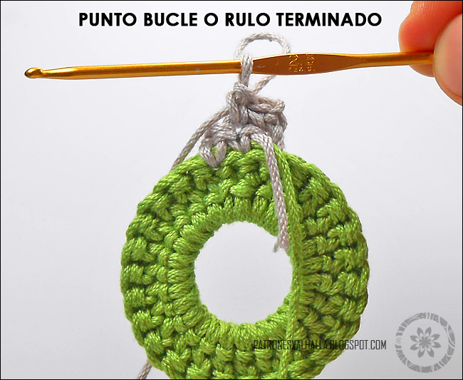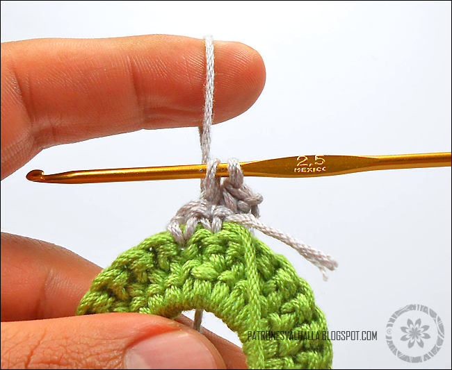 CAMBIO DE COLOR (GRIS) Levanta una cadena y haz 3 medios puntos. Levanta una cadena, haz un medio punto, un punto bucle o rulo y termina con un medio punto. Remata hilos sobrantes.