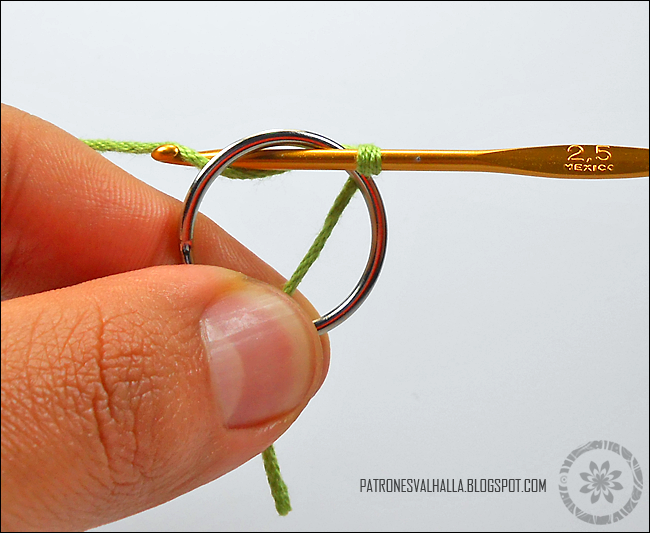 CONSEJOTE RECOMIENDO QUE COLOQUES TU NUDO CORREDIZO A ESPALDAS DE LA ARGOLLA Y POSTERIORMENTE HAGAS EL PUNTO DESLIZADO. APÓYATE DE TU MANO IZQUIERDA PARA SOSTENER EL HILO QUE VA UNIDO A TU MADEJA MIENTRAS QUE CON LA DERECHA SOSTIENES EL NUDO CORREDIZO Y EL GANCHILLO.