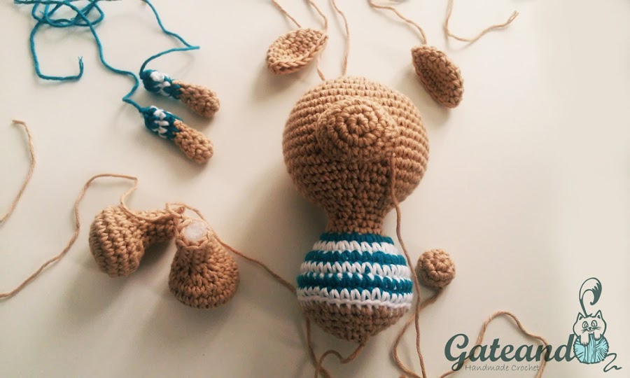 Cerrar con p.r., rellenar y dejar hebra larga para coser al cuerpo.