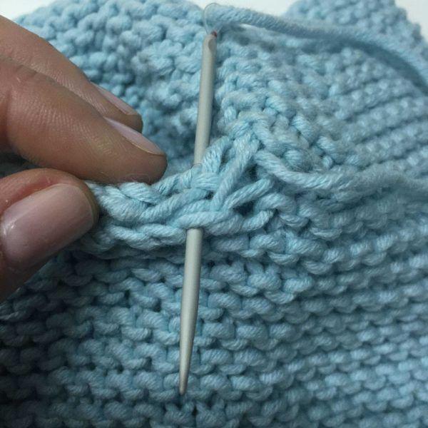 9ª vuelta: Pasar el primer punto sin hacer, tejer el segundo del derecho, echar hebra, tejer dos puntos juntos (este es el primer ojal) y terminar la vuelta a punto bobo.