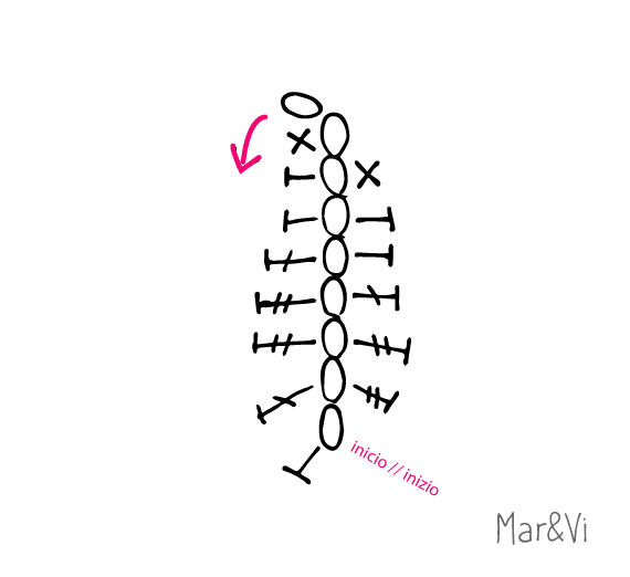 montar 8 cadenetas, subir con una cadeneta y tejer 1 p. bajo; 2 media vareta; 1 vareta; 2 doble vareta; 1 vareta; 1 media vareta; 2 doble vareta; 1 vareta; 2 media vareta; 1 p. bajo, cortar el hilo y perder.