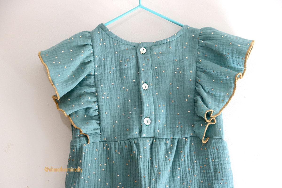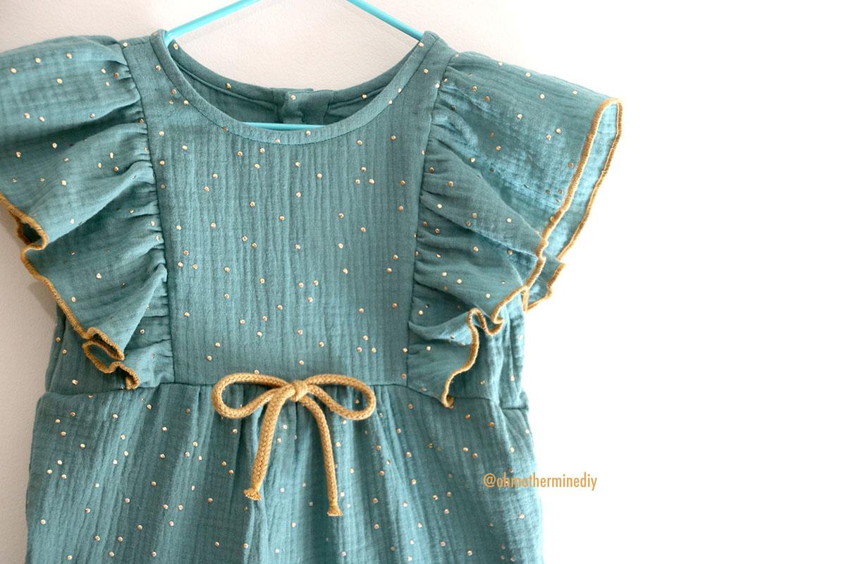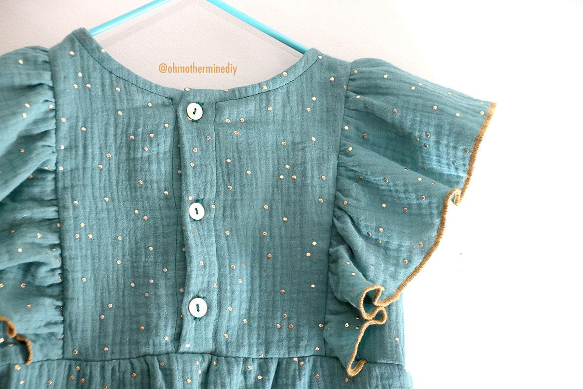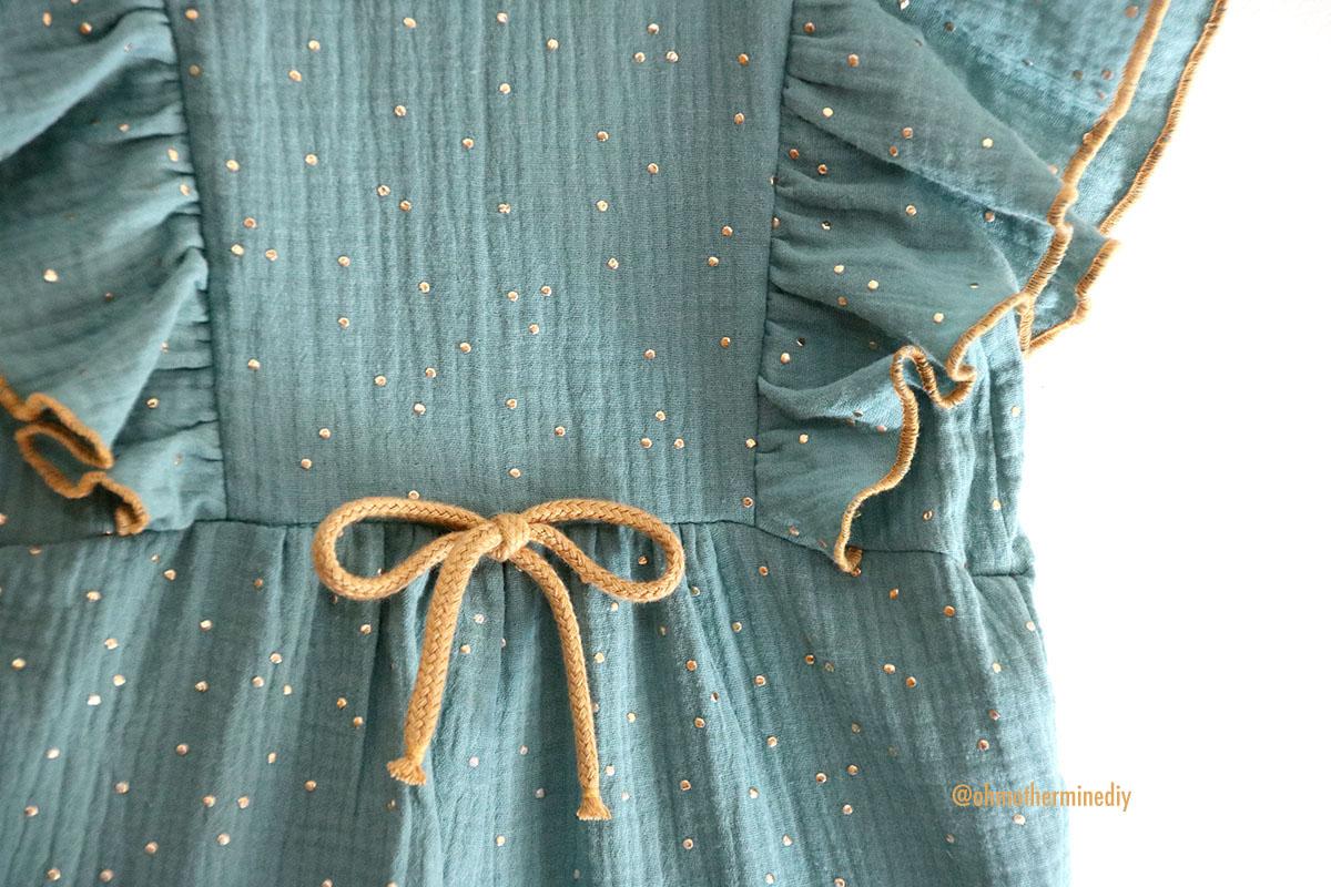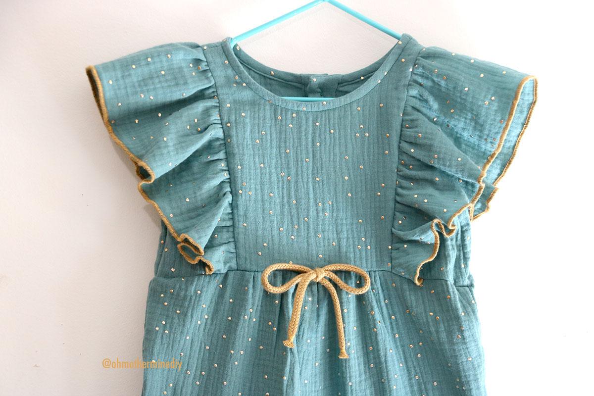 La tela que he elegido es una doble gasa con motitas doradas que compré en RATUCOS, ya sabéis que he comprado las telas de infantil para esta temporada en esta tienda, que dicho sea de paso: me encanta y son muy muy rápidos. Además de doble gasa o gasa sencilla, os animo a que probéis lyocell o tercel, incluso jeans que seguro que le queda fenomenal