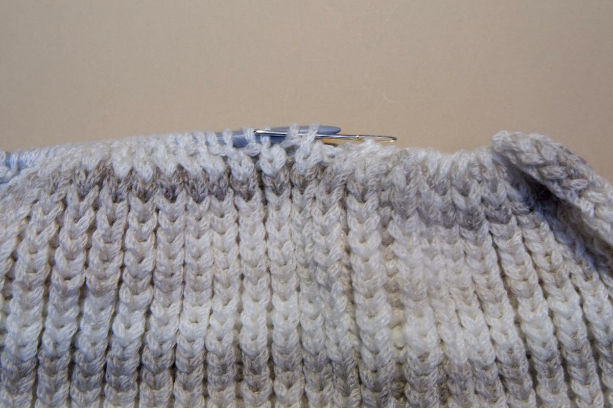 Una vez que tenemos el tamaño adecuado, cortamos la lana, la enhebramos en una aguja de coser lana y vamos sacando los punto de la aguja de tricotar.