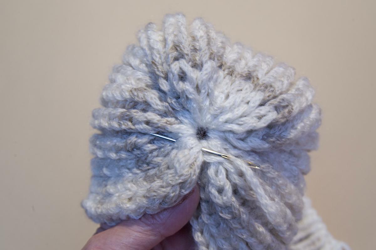 Cuando hemos sacado todos los puntos, tiramos de la lana para unir el gorro por la parte de arriba. Rematamos con un par de puntadas y continuamos cosiendo el lateral. Si te gusta puedes rematar el gorro con un pompón.