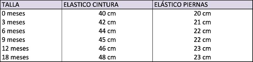 La costura es muy muy fácil, ya veréis que hemos hecho sencilla la colocación de los elástico tanto de las piernas como de la cintura para que el resultado os quede perfecto!!!! Además de dejaros por aquí el video tutorial para que no perdáis detalle, os dejo una tabla de medidas aproximada: