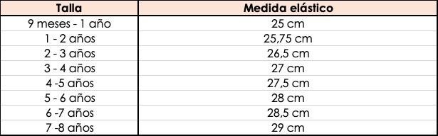 Y os dejo a continuación una tabla de medidas para el elástico del cuello para que os quede perfecto, son siempre medidas estándar aproximadas, no son las medidas de todas la pequeñas, así que si podéis hacerlo con la medida del contorno de cuello de la niña, seguro que os queda muchísimo mejor!