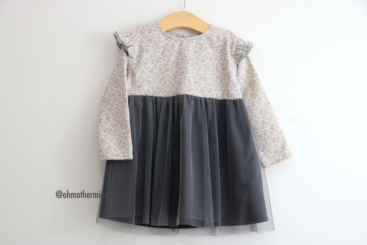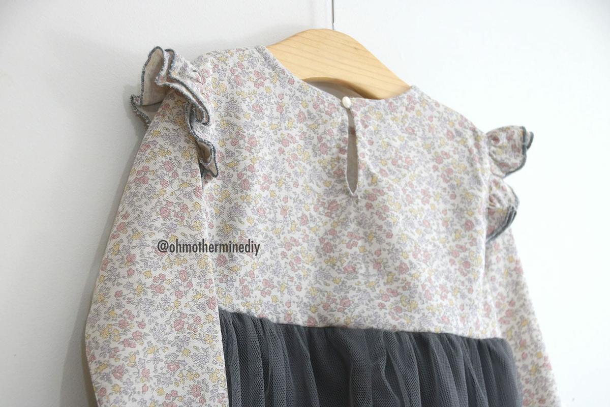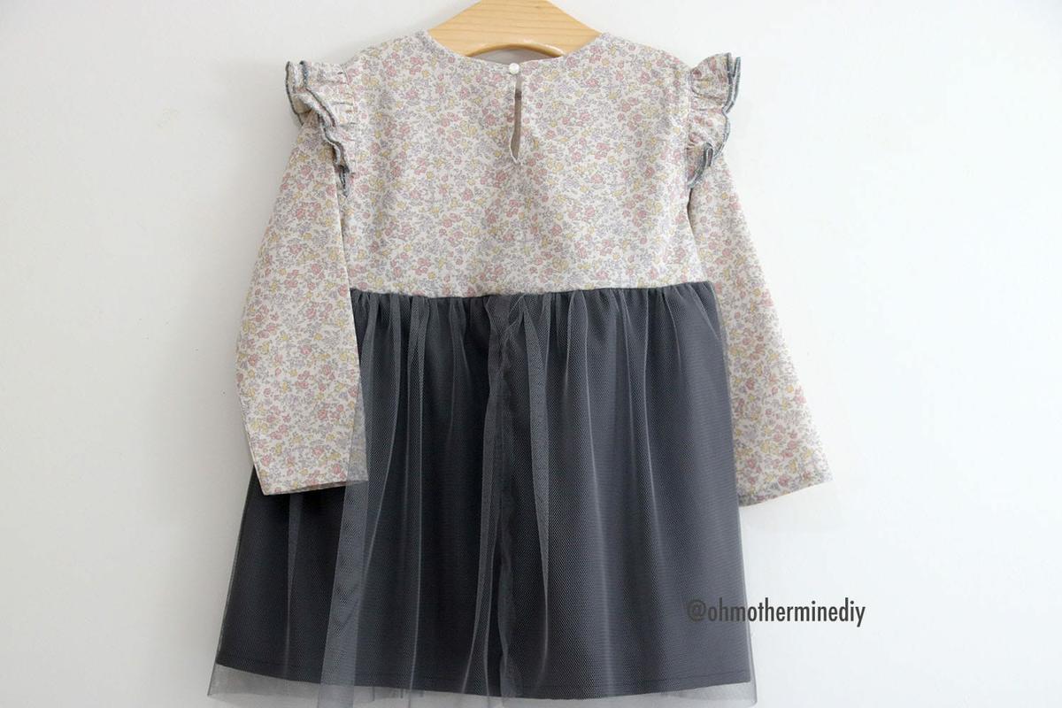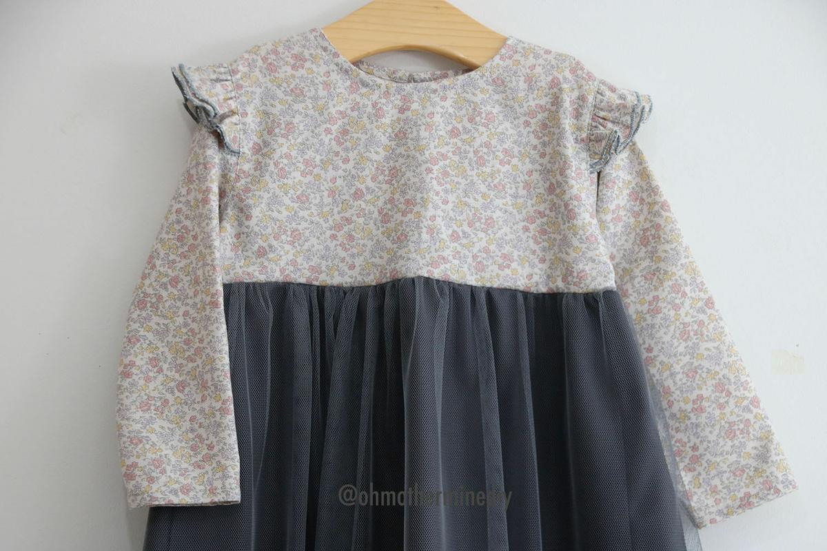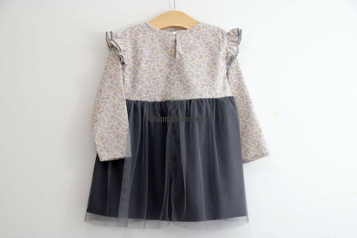 La parte de arriba es una viyela estampada de florecillas, y la parte de abajo es una mezcla de viyela y tul en color gris plomo. A mi me encanta la mezcla de telas y también la combinación de colores!!!!