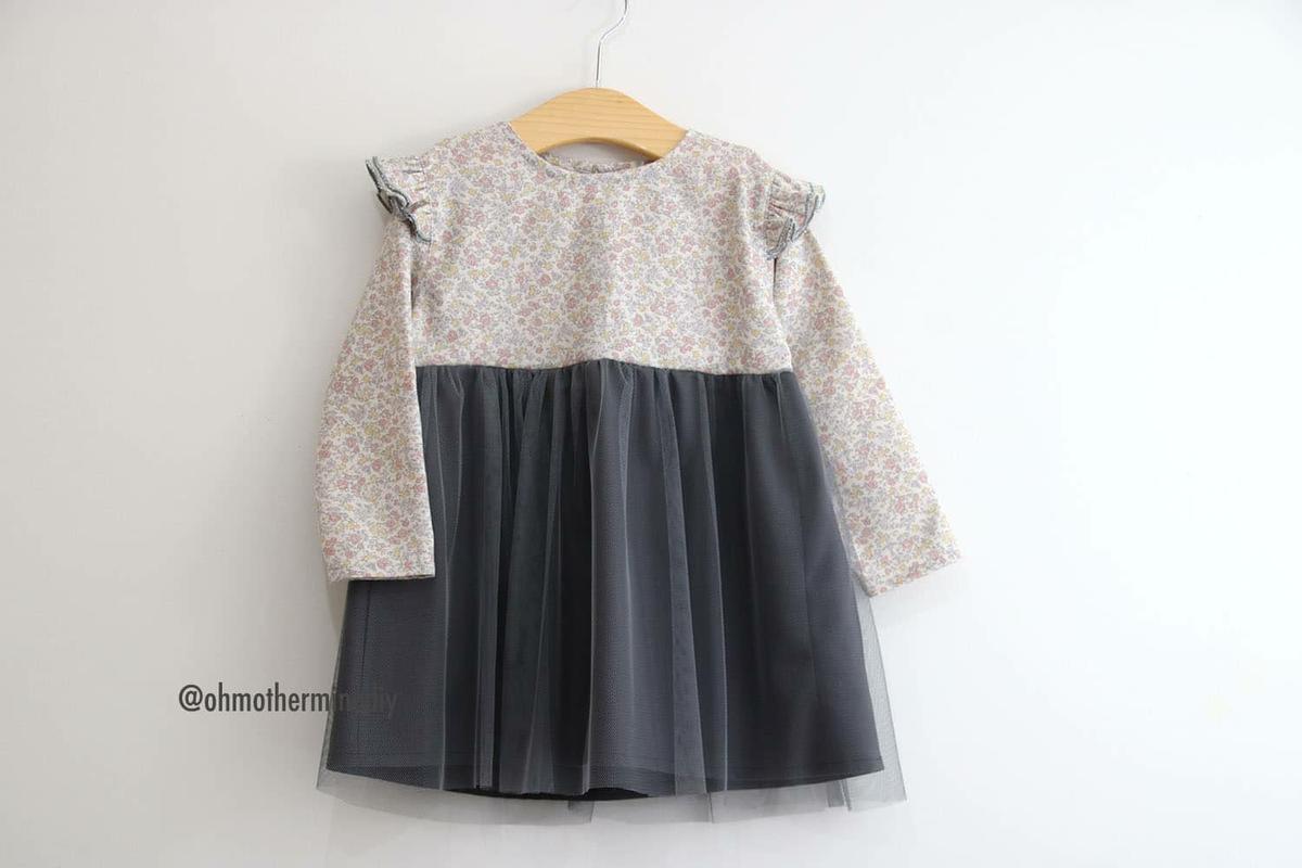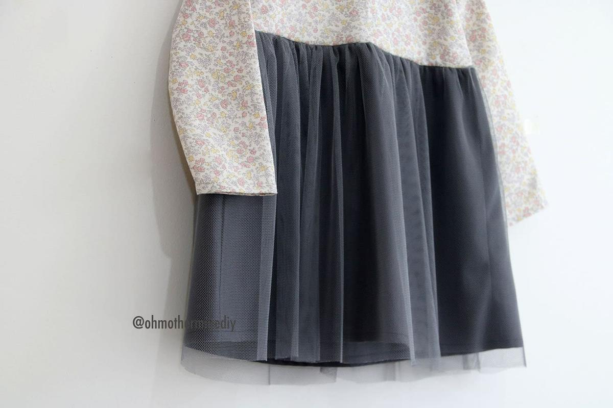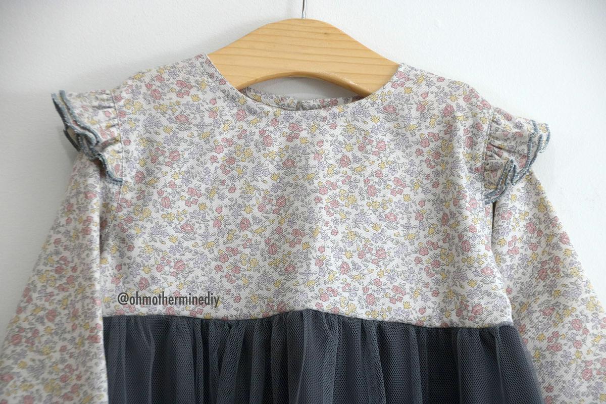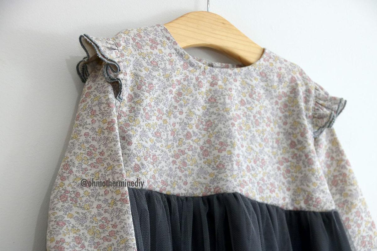 La parte de arriba es una viyela estampada de florecillas, y la parte de abajo es una mezcla de viyela y tul en color gris plomo. A mi me encanta la mezcla de telas y también la combinación de colores!!!!