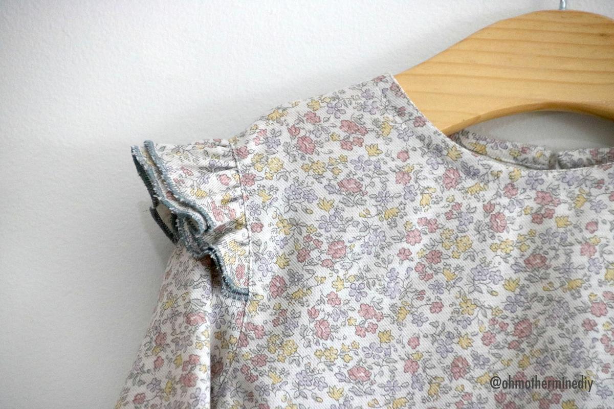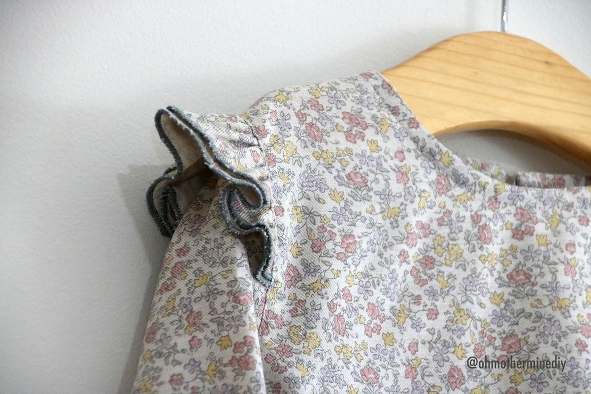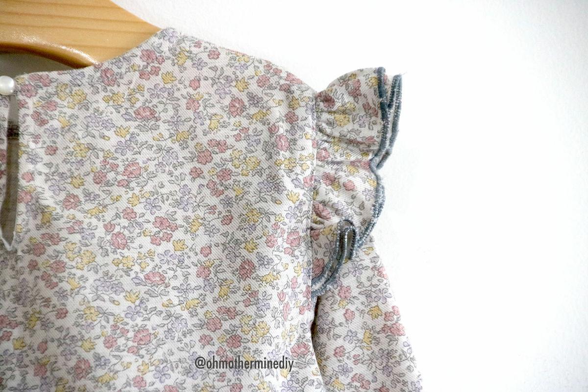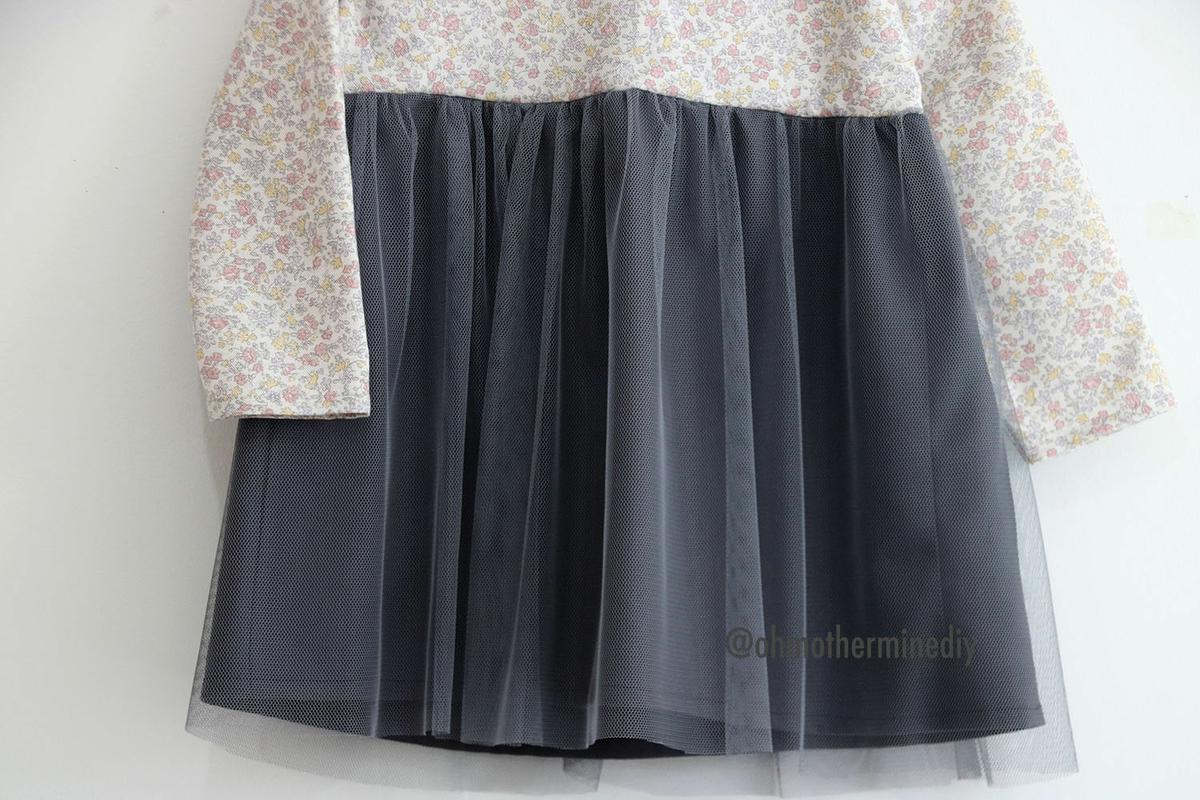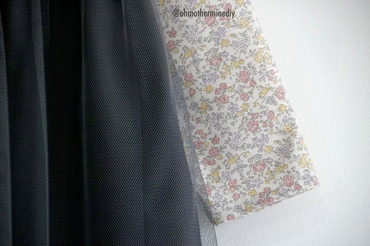La parte de arriba es una viyela estampada de florecillas, y la parte de abajo es una mezcla de viyela y tul en color gris plomo. A mi me encanta la mezcla de telas y también la combinación de colores!!!!