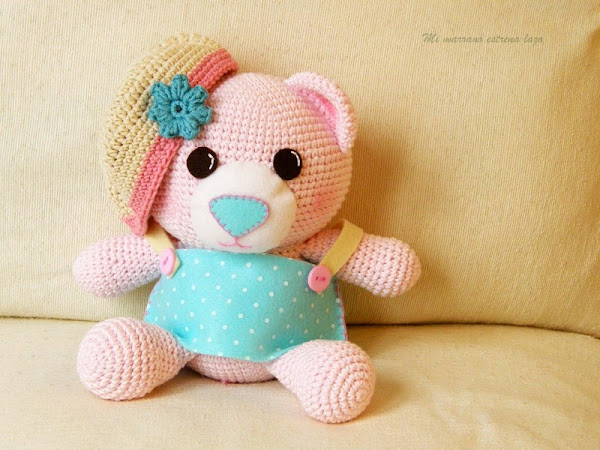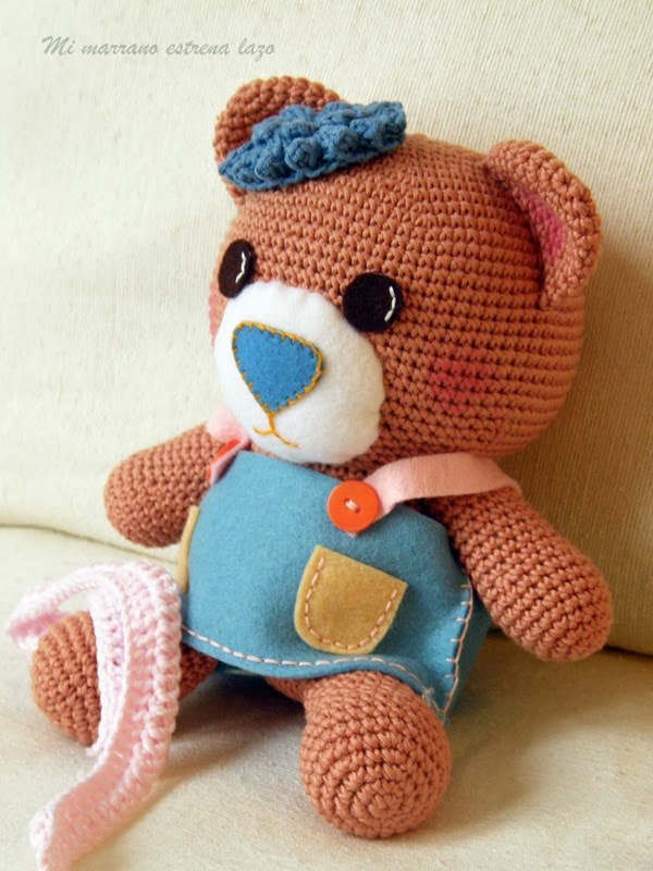 Laura lleva un vestido de fieltro azul vaquero, tiene dos bolsillos de color amarillo clarito y unos tirantes rosas que rematan con dos botones de color nanaranja, su bufanda es rosa y en la cabeza lleva una flor de color azul, para ir a juego con su estupendo vestido, pero que presumidas son estas dos ositas.