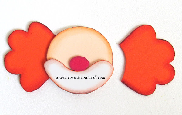 Pegamos la carita del payasito y sus zapatitos en los dulces que vamos a regalar.