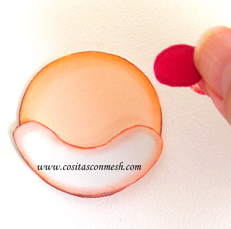 Para el sombrero, use plumón verde oscuro, para la cara, use plumón naranja, para el cabello plumón rojo, para la boca use plumón naranja, luego de delinear todas mis piezas de foami, use hisopo y difumine en todo el delineado, asi quedara sombreado.