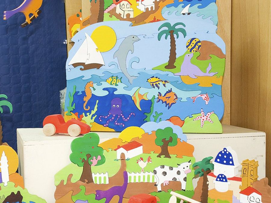 Un dibujo realizado en grupo, lleno de figuras graciosas, se presta a convertirse en magnífico puzzle que hará las delicias de los pequeños. Una vez completada la escena, pegaremos el folio en un soporte, que nuevamente puede ser cartón o madera de balsa. A continuación, damos sobre la escena una capa de barniz para manualidades, y cuando haya secado ya podemos recortar los elementos, procurando, si son niños de pocos años, que las piezas tengan buen tamaño y ofrezcan aliciente visual.