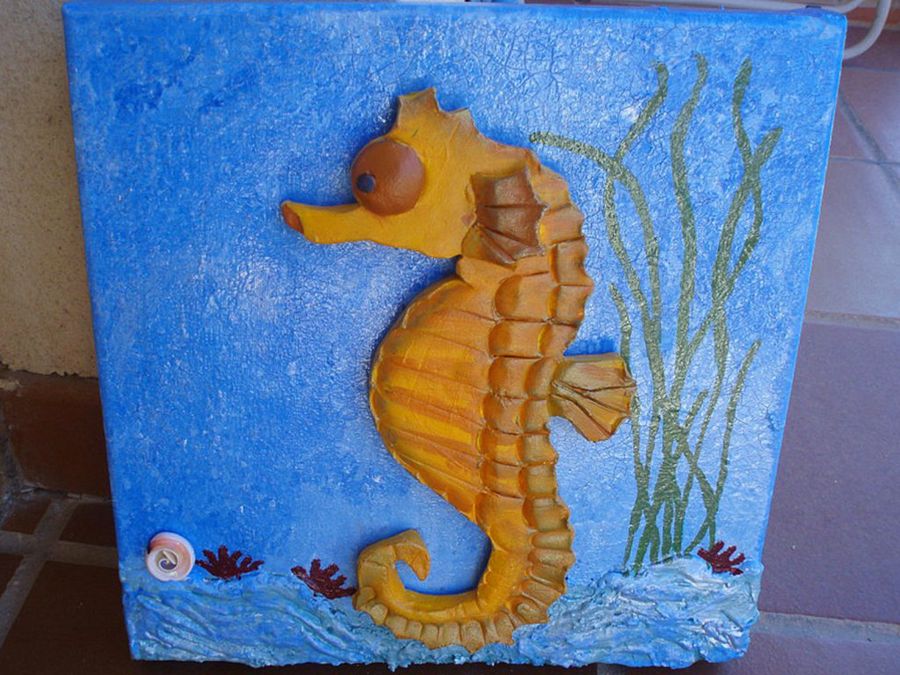 La pasta de modelar permite regocijantes trabajos en relieve, que pueden colorearse de la manera más llamativa y alegre. El caballito de mar creado por nuestra lectora Amamas es un magnífico ejemplo. Observemos el uso de colores básicos y complementarios, amarillo y azul en este caso, algo que resulta muy atractivo para los jóvenes artistas.