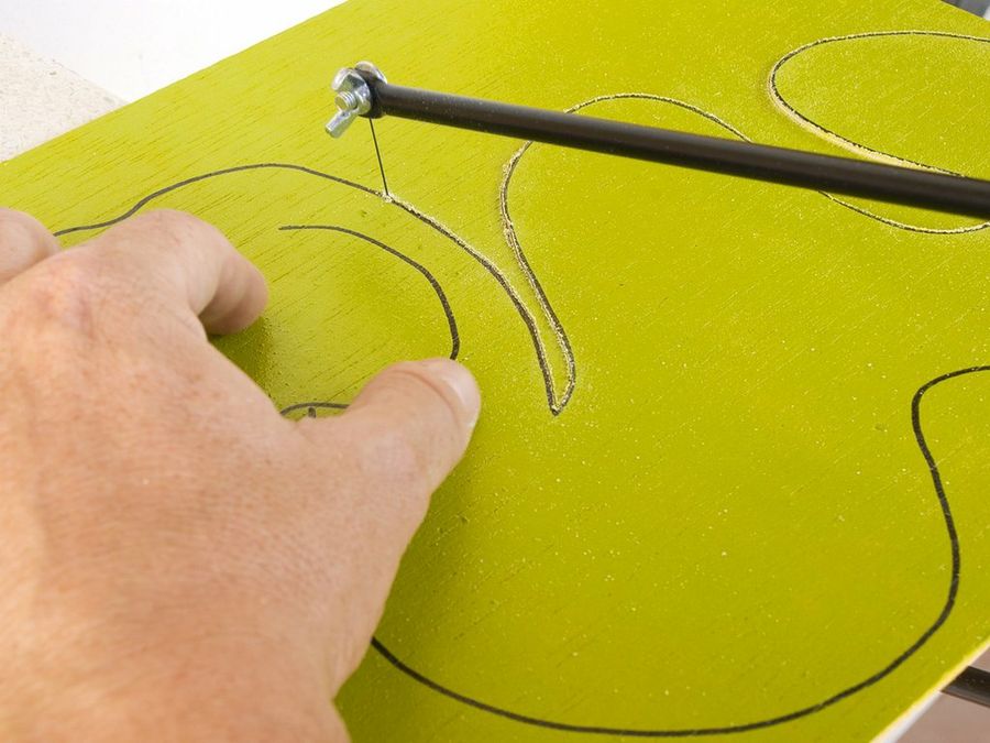 La madera es otro material con deslumbrantes posibilidades en los trabajos infantiles. Para hacer las figuras de un móvil colgante, emplearemos un tablero fino, de 2 mm, y, tras aplicar una base del color adecuado, dejaremos que los niños dibujen sus animales predilectos. Sólo falta recortar las siluetas con la sierra de marquetería, lijar los cantos y dejar que los pequeños pinten ojos, bocas, escamas y otros rasgos particulares, que darán mucha vida a las figuras.