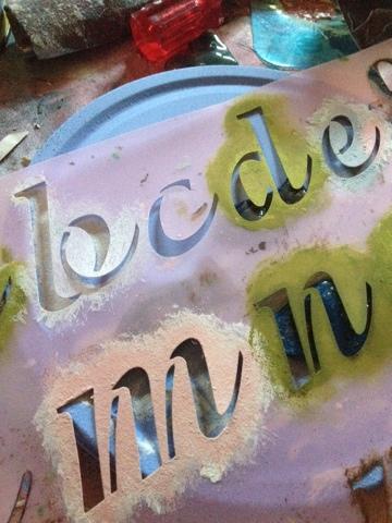 Ahora cogi una tapa de una lata de galletas y la pinté de azul claro y le hice un stencil con beach y unos rayajos blancos en forma de olas?.
