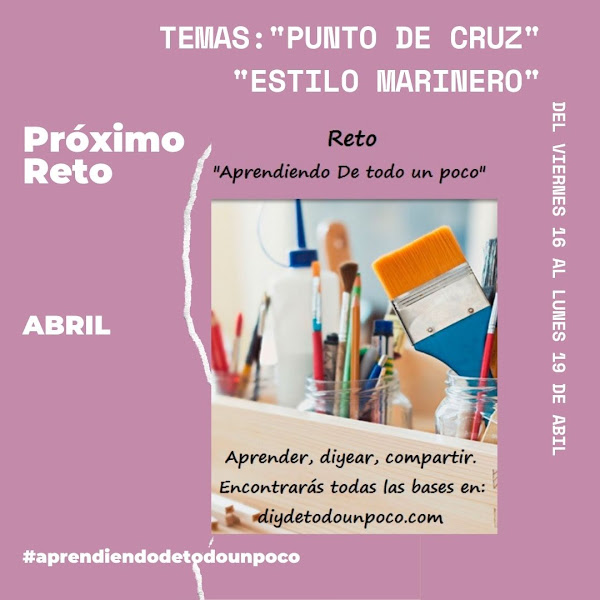 Otra vez esta aqui en DIY De Todo un Poco con Anna Llansa, en esta edicion de Abril, los temas son Punto de Cruz y Estilo Marinero escogidos respectivamente por Isabel de Alromasar y Lola de El refugio de Lirtea, ambas ganadoras del mes anterior.