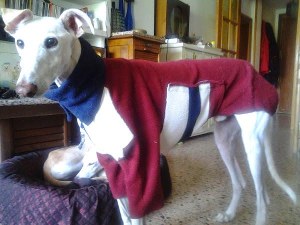 Mientras me ha dedicado a hacer una cama para la galga , una funda nueva para la cama de Caballero, un abrigo en tonos británicos para que no tenga frió por esas tierras tan verdes y estoy ahora con un chubasquero.