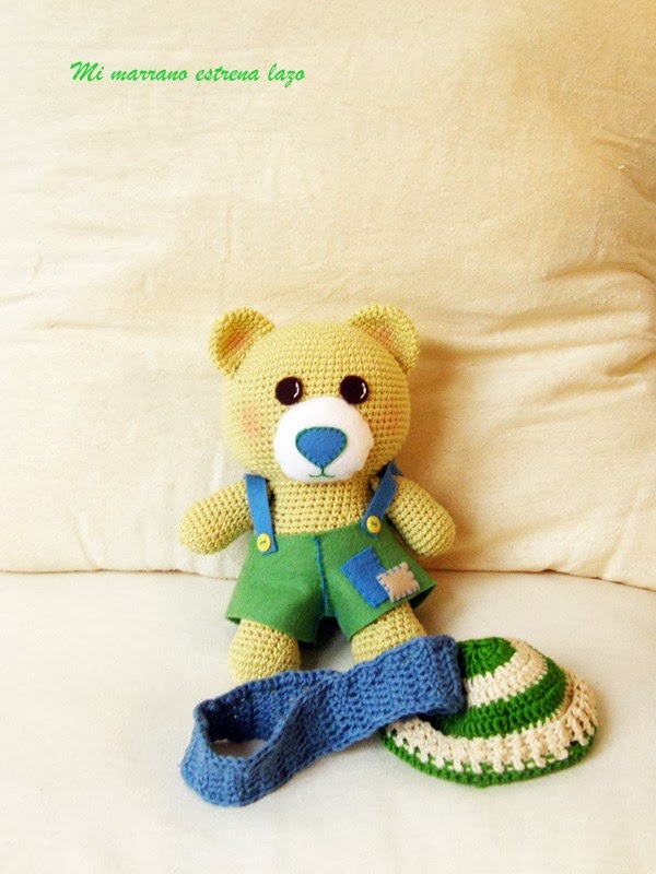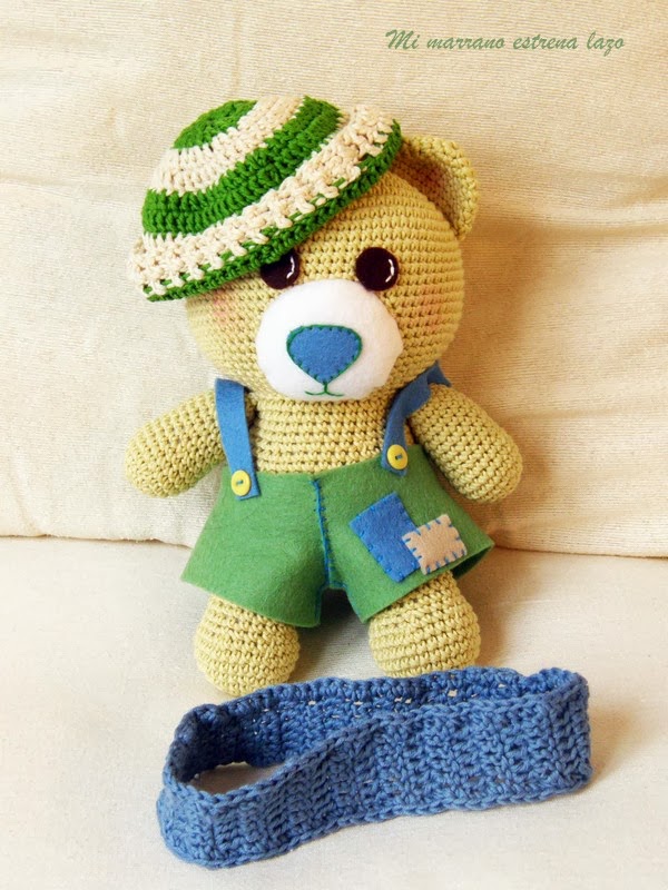 Como todos sus hermanos, Pedro, está realizado con algodón 100 %, ovillos Natura de DMC, igual que la bufanda y el cuello, la ropa está realizada en fieltro de lana 100% muy suave y confortable.