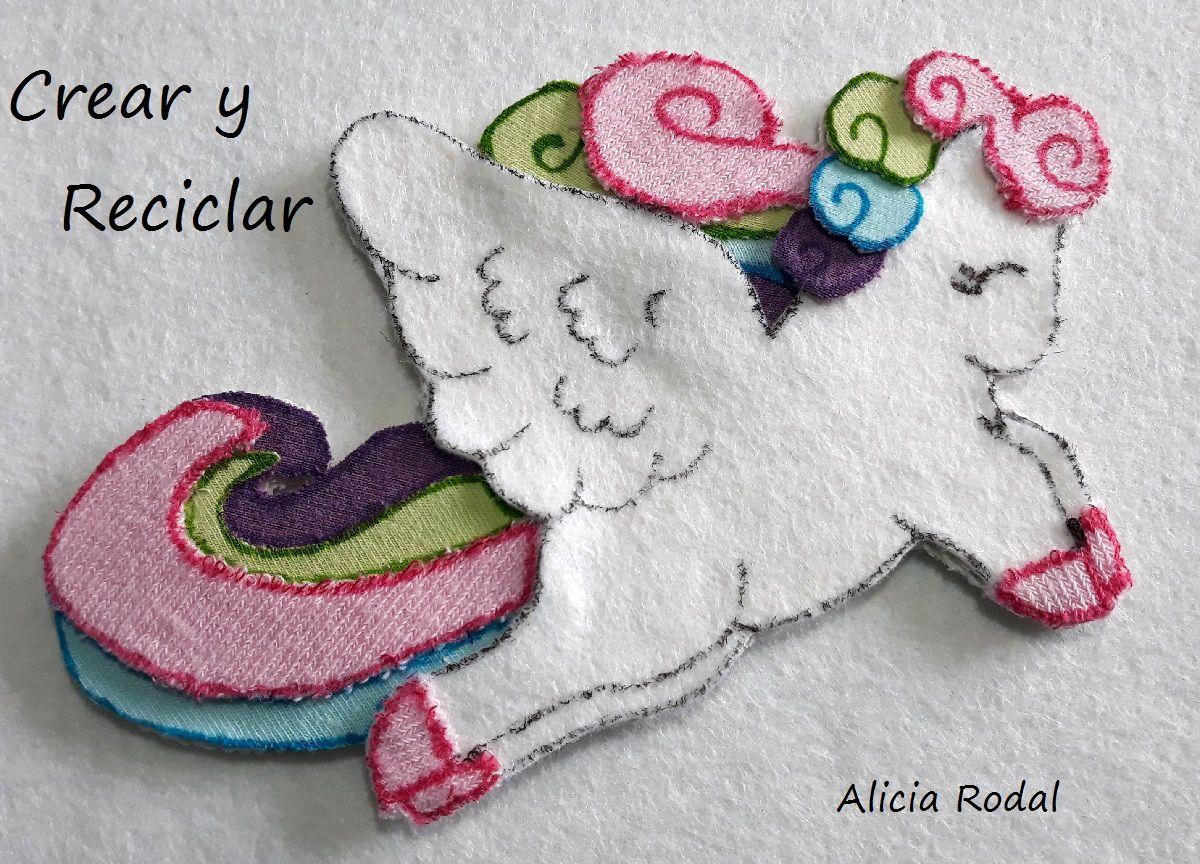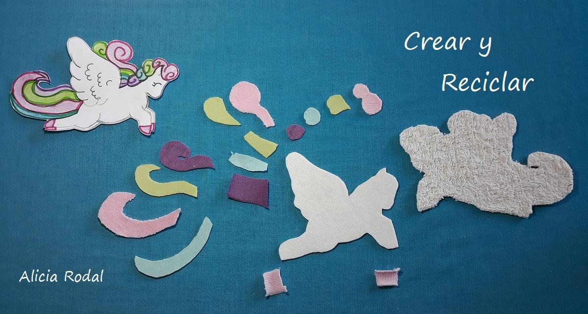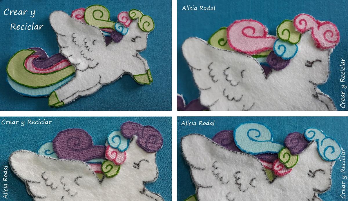 Yo hice estos 4 preciosos Pegasos de 4 colores diferentes, combinados entre sí, resaltando uno de los colores en cada uno de ellos. Los colores que escogí fueron el rosa, el morado, el verde y el azul. Me hubiese gustado que los colores fueran un poco más pasteles, sobre todo el morado, pero esos son los colores que tenía a mano de las camisetas viejas y manchadas de mis hijas.