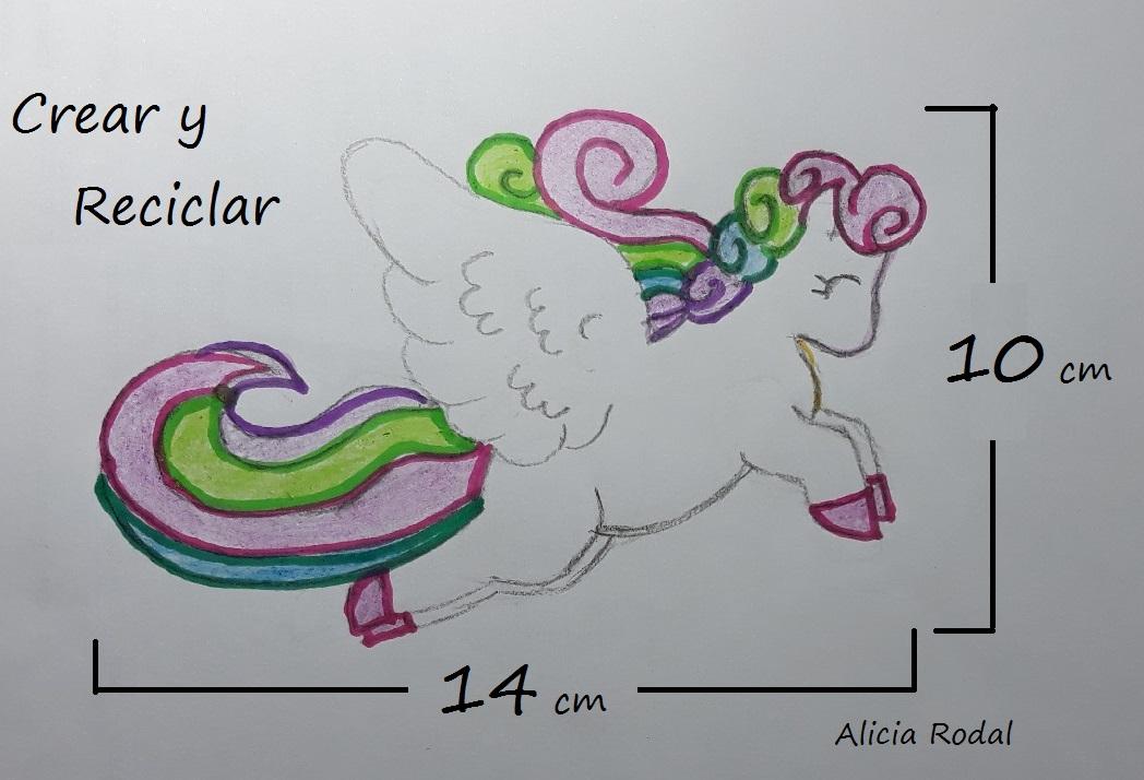 En esta imagen puedes ver la plantilla del Pegaso, según el dibujo que hice yo misma a mano alzada, de 10 centímetros de alto por 14 de ancho aproximadamente: