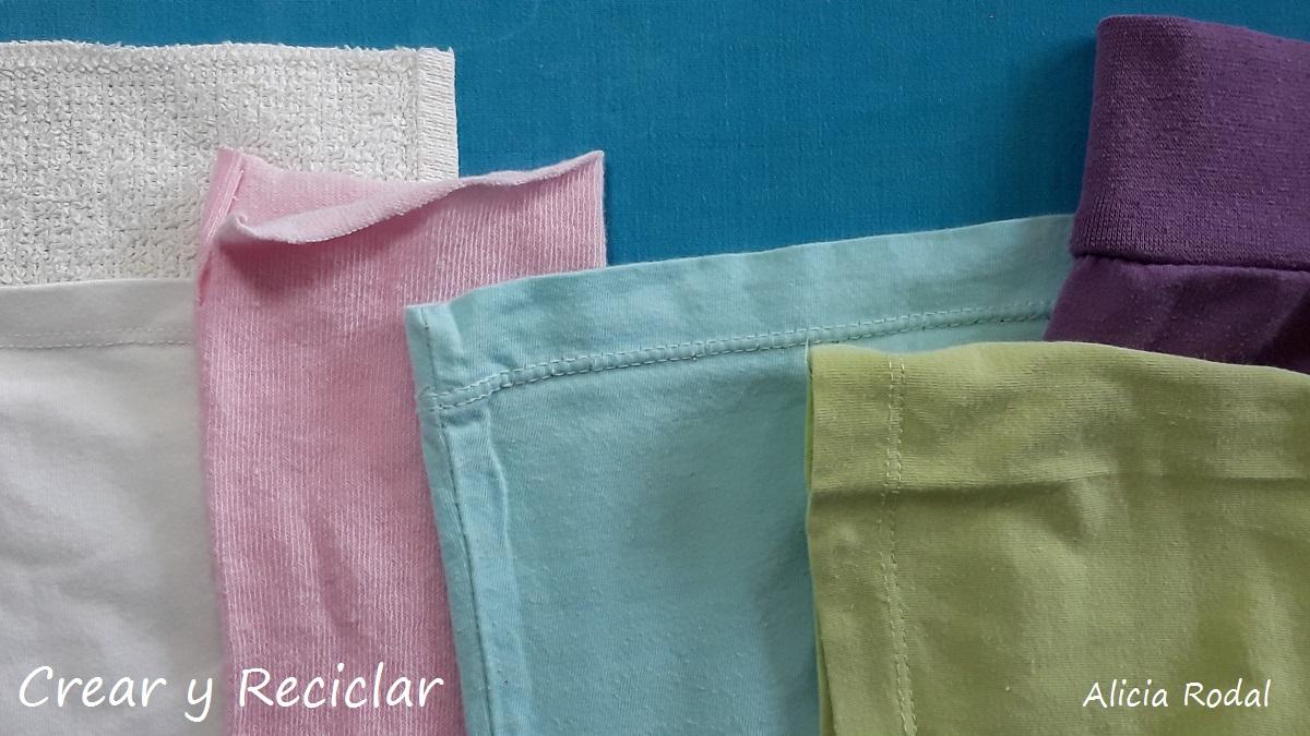 Retales de telas de diferentes colores (yo reutilizaré tela de franela rosada, azul, verde y morada o lila, y tela de toalla o felpa blanca para la parte de atrás.