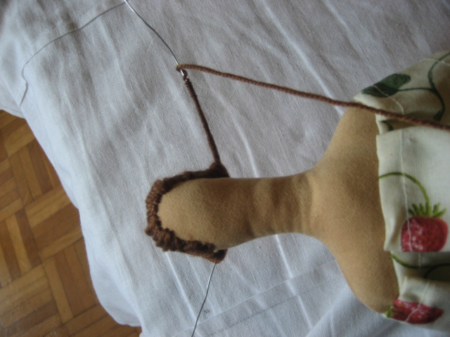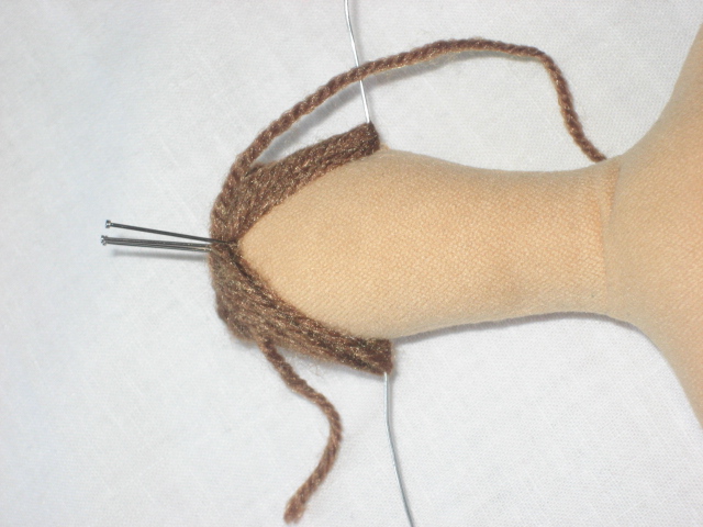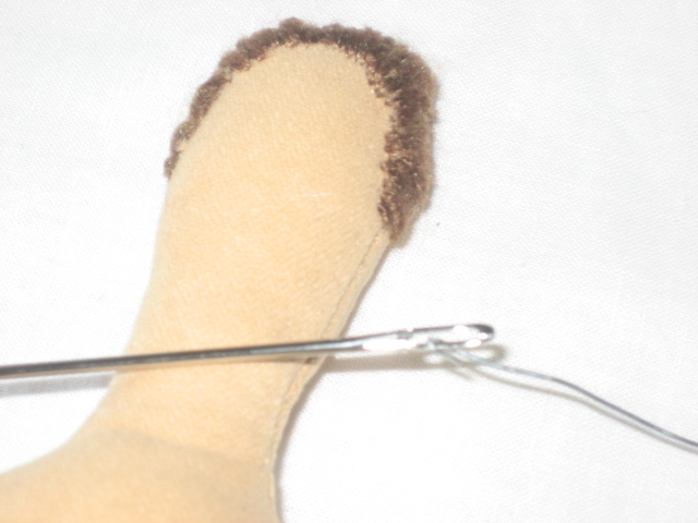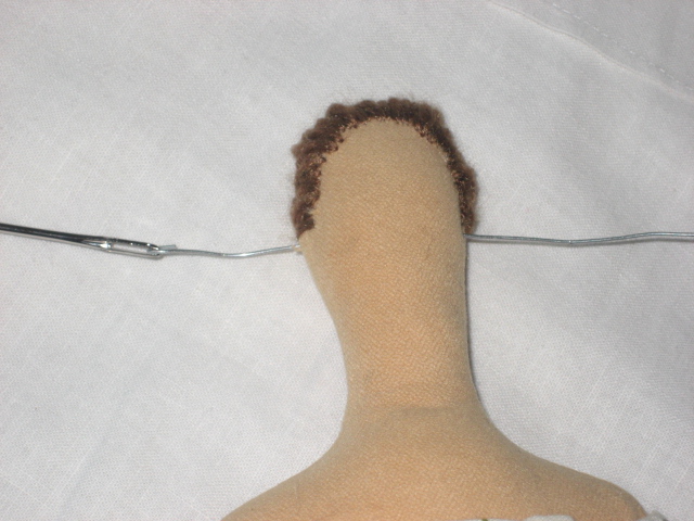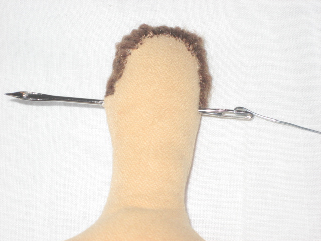 Con una aguja pasamos el alambre entre las costuras de un lado a otro de la cabeza.