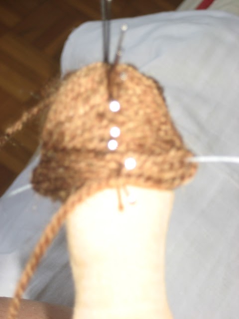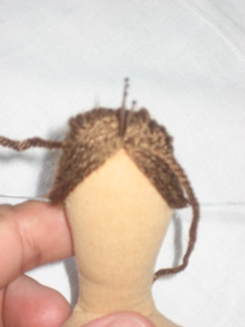 Empezamos a pasar la lana de un lado a otro, vamos colocando alfileres dividiendo la cabeza en dos , pasamos la lana entre los alfileres , asi hasta que quede bien rellenito.