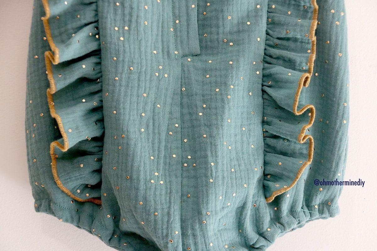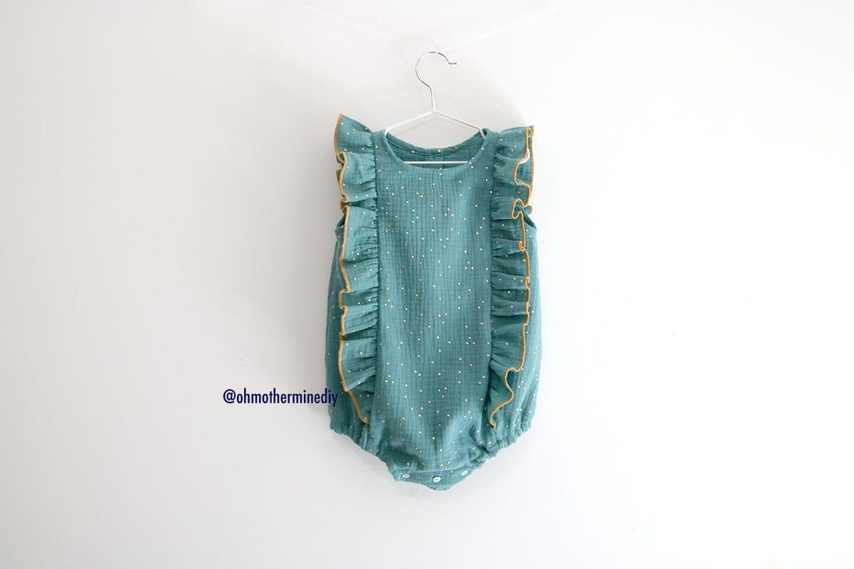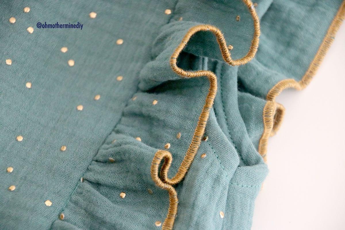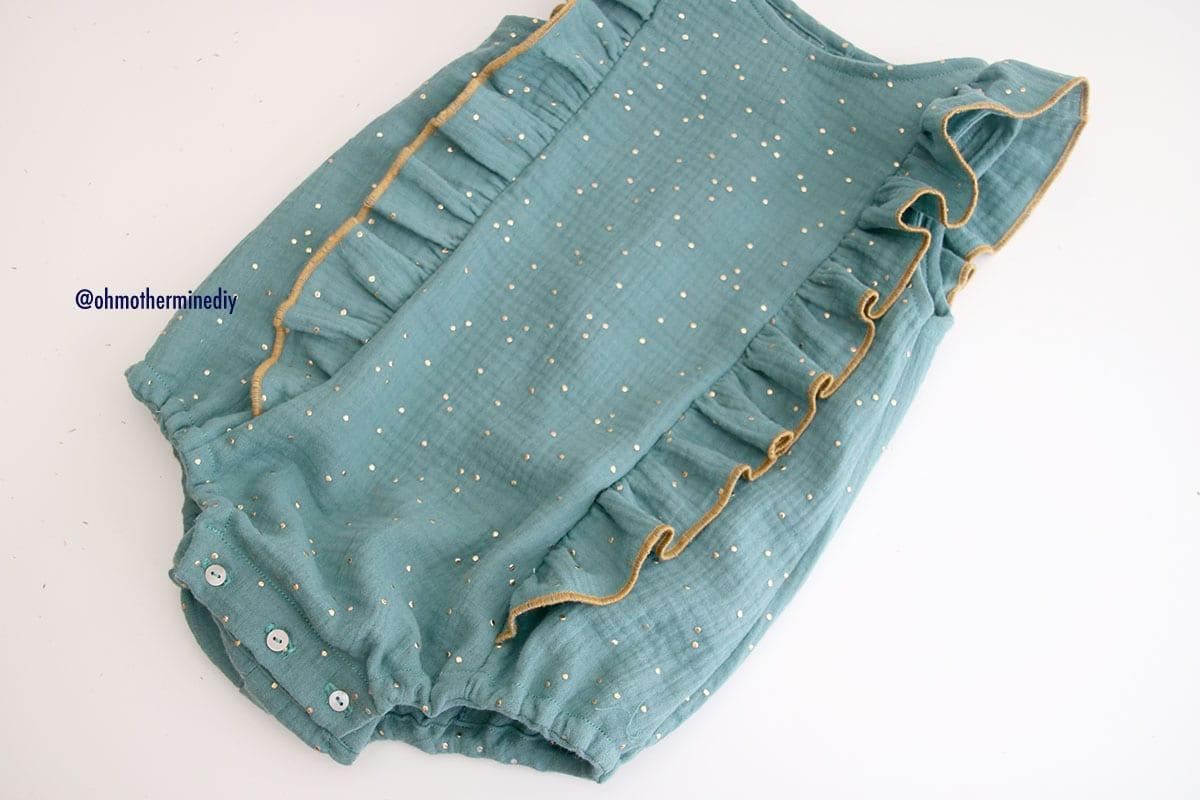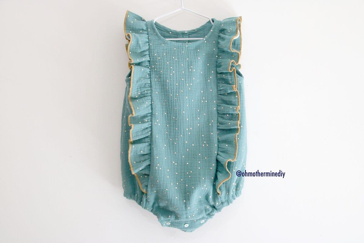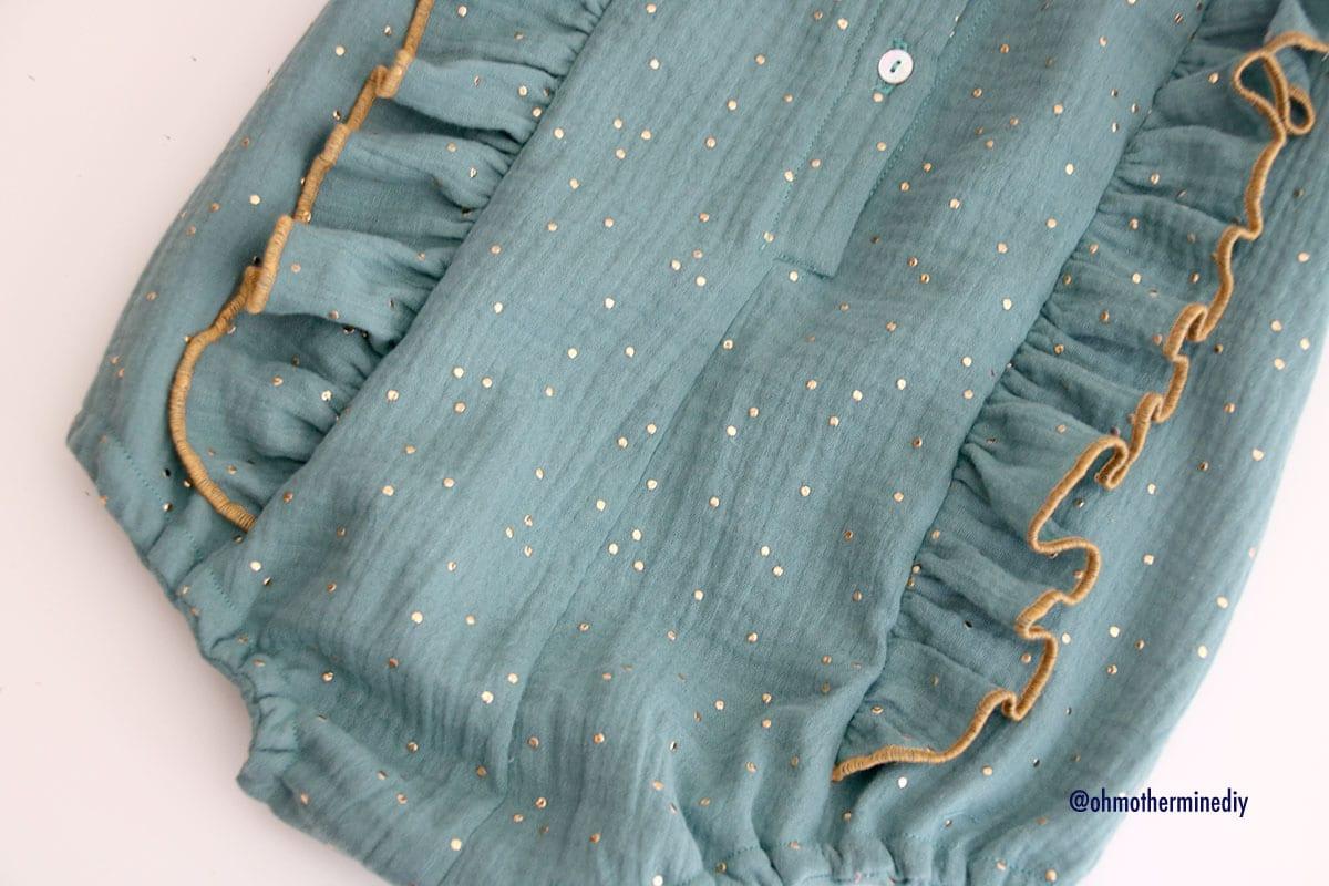 Hoy como no podía ser de otra manera, vamos a seguir compartiendo conocimientos, costura y patrones. En esta ocasión, para los más pequeños de la casa! Un pelele o ranita para niñas y niños con volantes en tela doble gasa con motas doradas Las terminaciones están hechas con la remalladora, un canutillo o remallado pequeño que hace contraste de colores con la tela. Si no tenéis remalladora, podéis hacer realizar esta terminación de tres formas diferentes: dobladillo finito, con una puntilla o encaje al borde y/o con una puntada en zigzag muy pequeñita (la de ojal) hecha al borde de la tela.