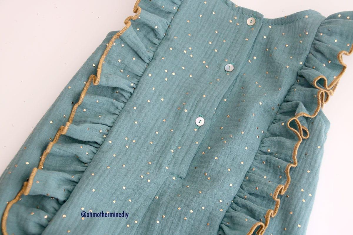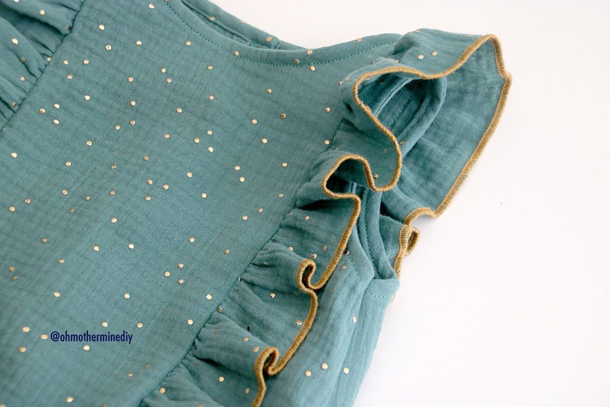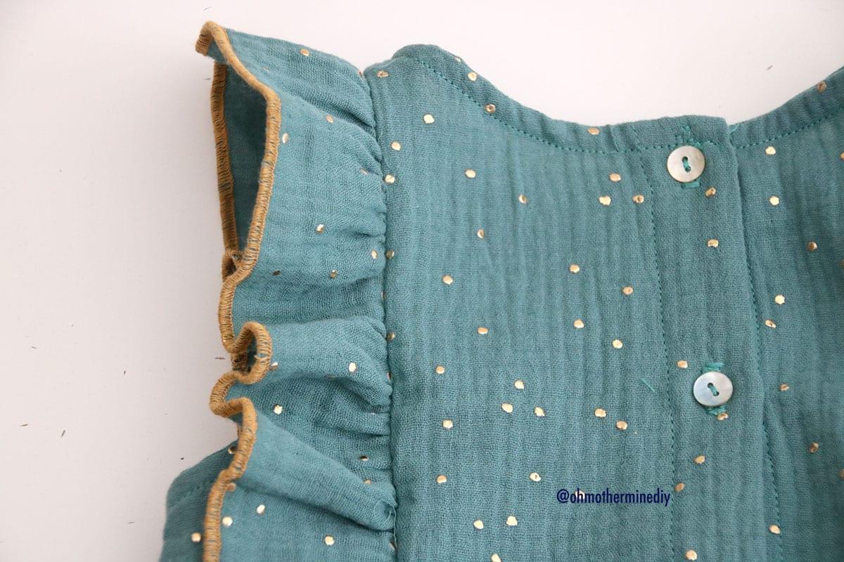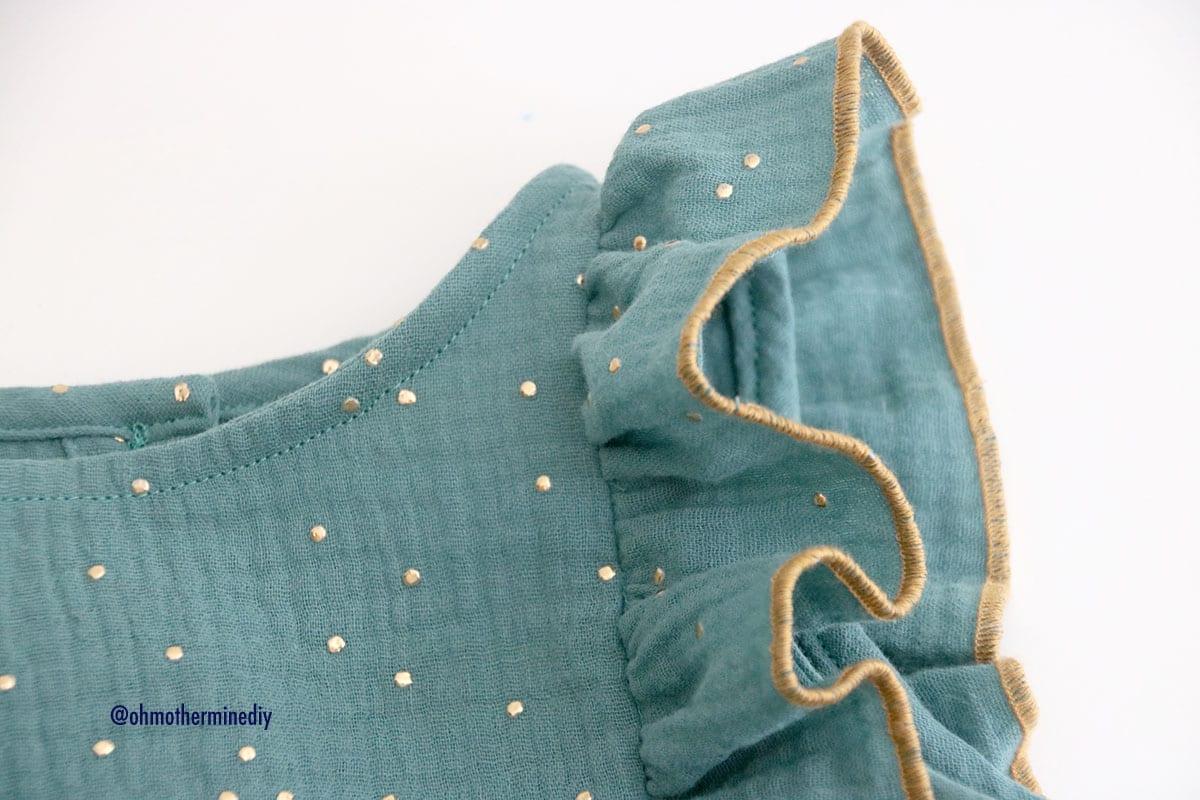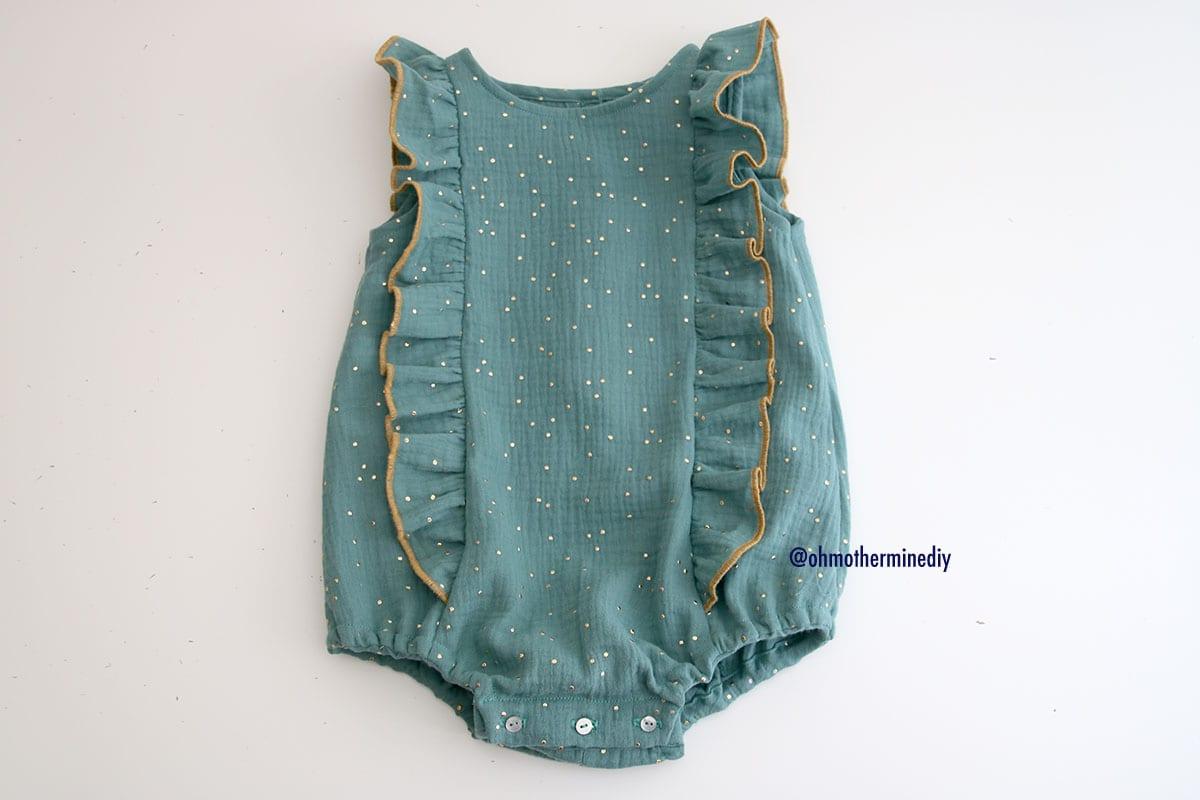 Hoy como no podía ser de otra manera, vamos a seguir compartiendo conocimientos, costura y patrones. En esta ocasión, para los más pequeños de la casa! Un pelele o ranita para niñas y niños con volantes en tela doble gasa con motas doradas Las terminaciones están hechas con la remalladora, un canutillo o remallado pequeño que hace contraste de colores con la tela. Si no tenéis remalladora, podéis hacer realizar esta terminación de tres formas diferentes: dobladillo finito, con una puntilla o encaje al borde y/o con una puntada en zigzag muy pequeñita (la de ojal) hecha al borde de la tela.