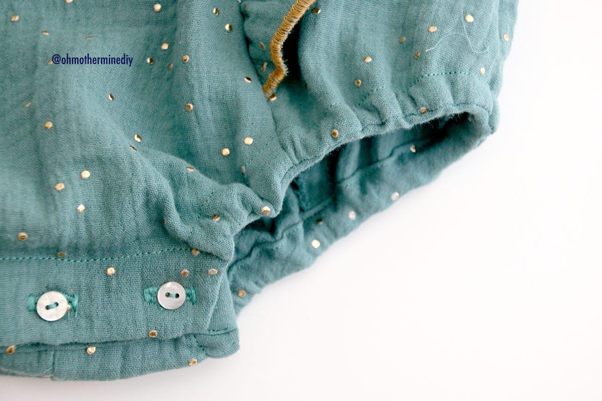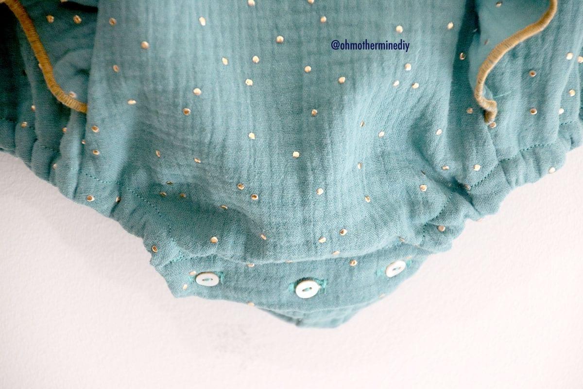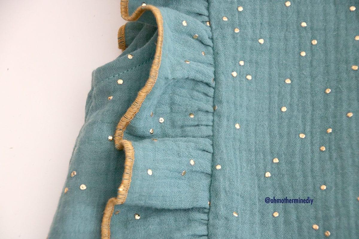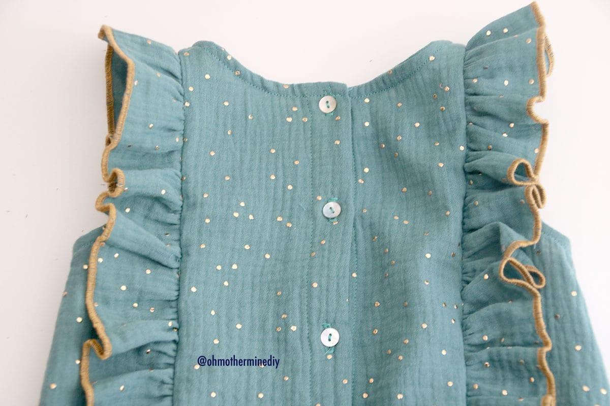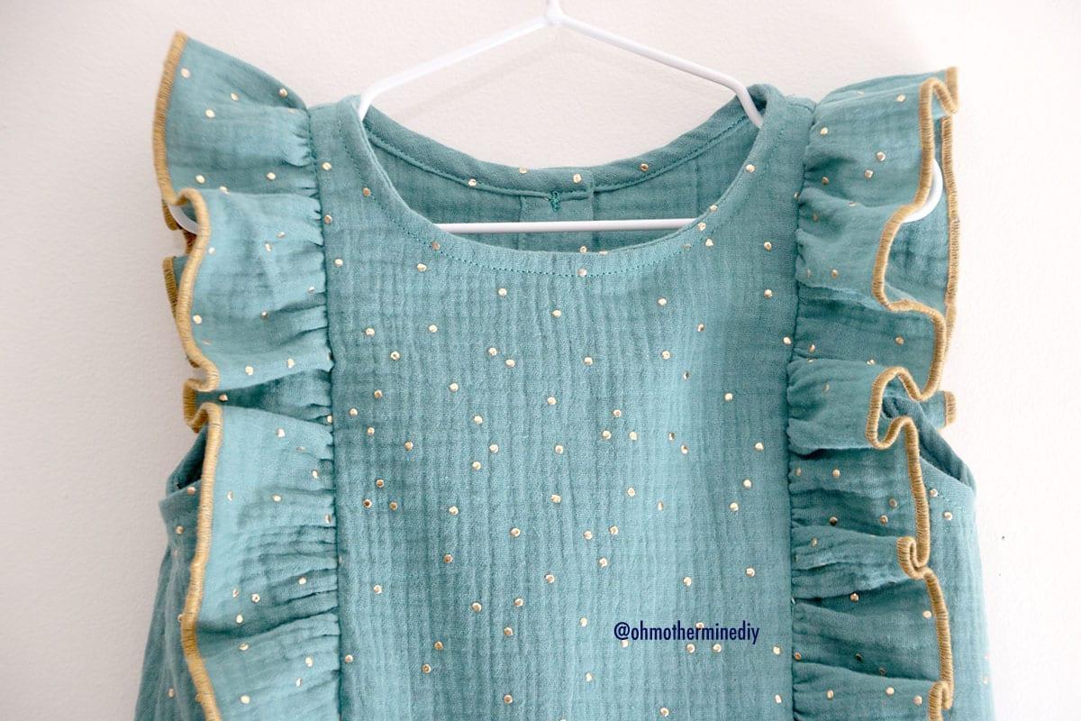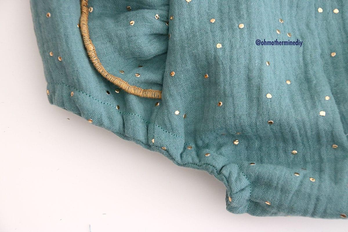 Hoy como no podía ser de otra manera, vamos a seguir compartiendo conocimientos, costura y patrones. En esta ocasión, para los más pequeños de la casa! Un pelele o ranita para niñas y niños con volantes en tela doble gasa con motas doradas Las terminaciones están hechas con la remalladora, un canutillo o remallado pequeño que hace contraste de colores con la tela. Si no tenéis remalladora, podéis hacer realizar esta terminación de tres formas diferentes: dobladillo finito, con una puntilla o encaje al borde y/o con una puntada en zigzag muy pequeñita (la de ojal) hecha al borde de la tela.