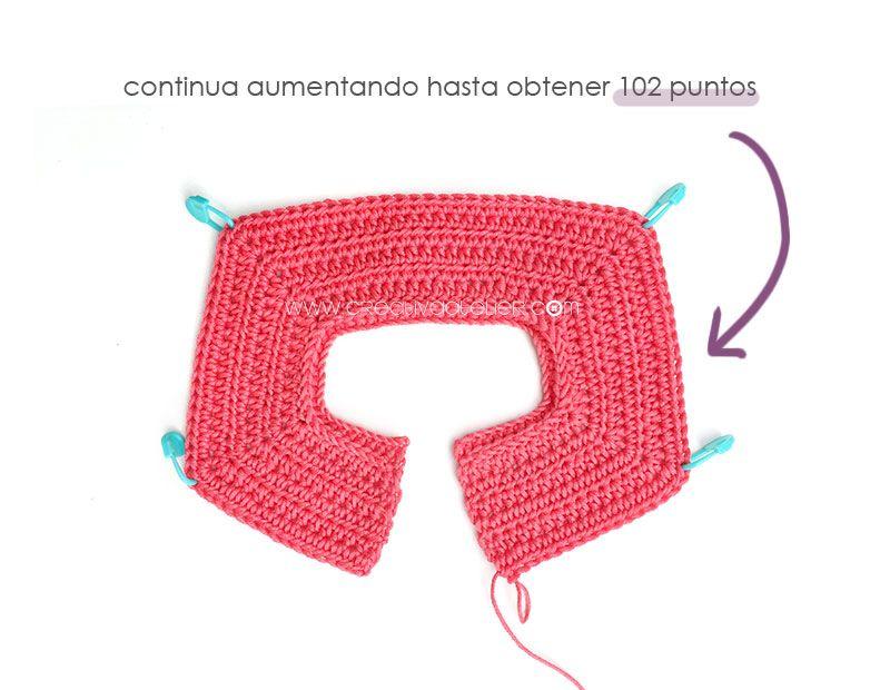 A partir de aquí comenzaremos a trabajar con los marcadores de puntos para saber en todo momento donde tenemos que hacer los aumentos. Cada vez que el patrón te pida hacer un aumento triple debes trabajar 3 mpa en el mismo punto y colocar el marcador en el punto central de estos tres.
