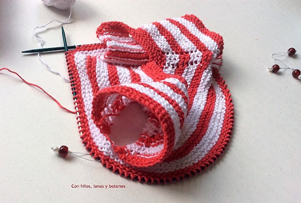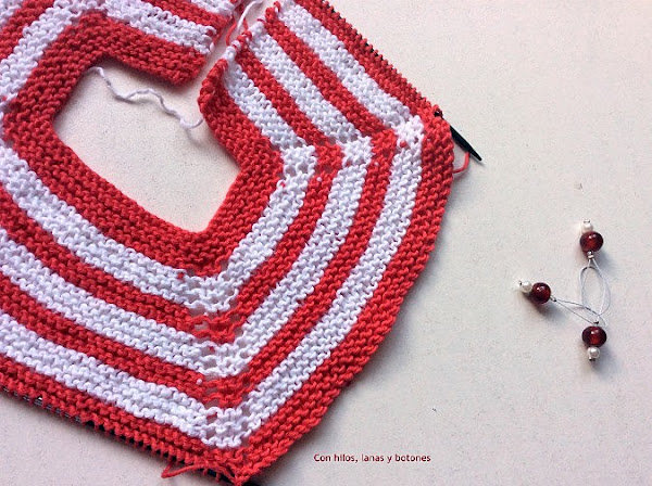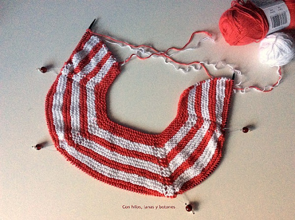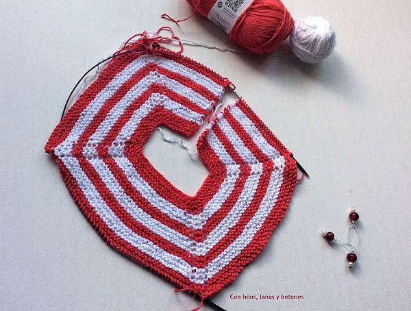 Vamos alternando las franjas blancas y color coral con aumentos hasta tener 3 blancas y 3 de color coral.