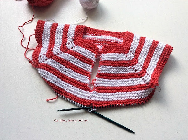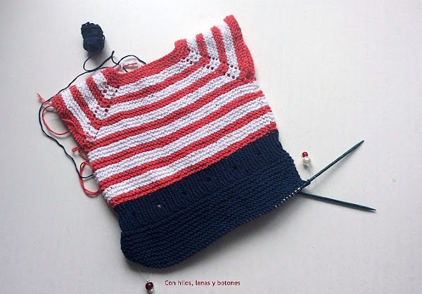 Tejemos hasta tener 3 franjas blancas y 3 franjas coral desde la separación de las mangas.