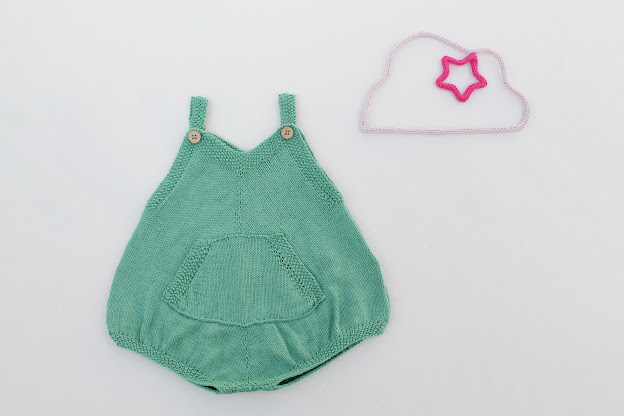 This type of knitted garments (baby rompers, onesies, jumpsuits...) are my favorite kind when I have to make things for babies because they always look good and any detail, as the front pocket in this design, add a very original touch.
