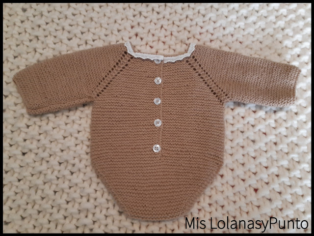 En el cuello le he puesto una puntilla alrededor, para darle mi toque personal y hacerlo un poquito más bonito. Y a los patucos, en vez de ir cerrado con un botón, va con dos tiras que anudamos, para que vaya al piececito más sujeto.