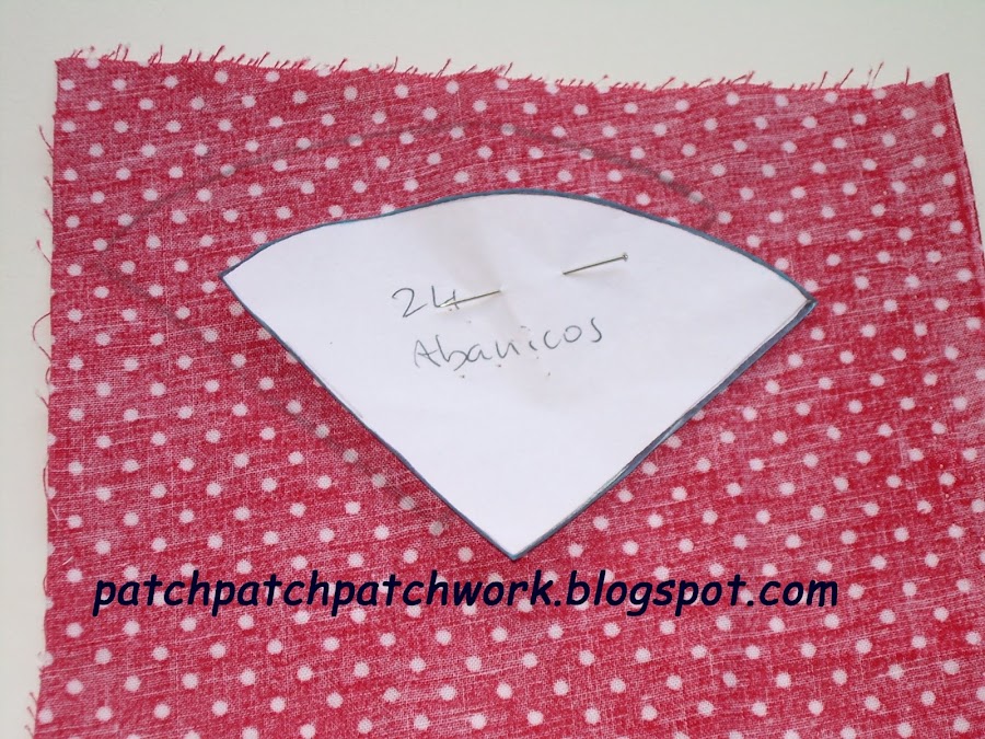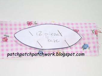 Para ello cortaréis los trozos ( 12 de un color y 24 de otro) de tela donde os quepa cada patrón. Unos 7cm. u 8cm. de largo. Cogéis los patrones y los dibujáis en el revés de la tela. El largo tiene que coincidir en ambos para que las costuras queden bien.