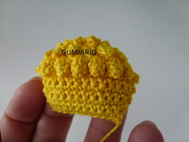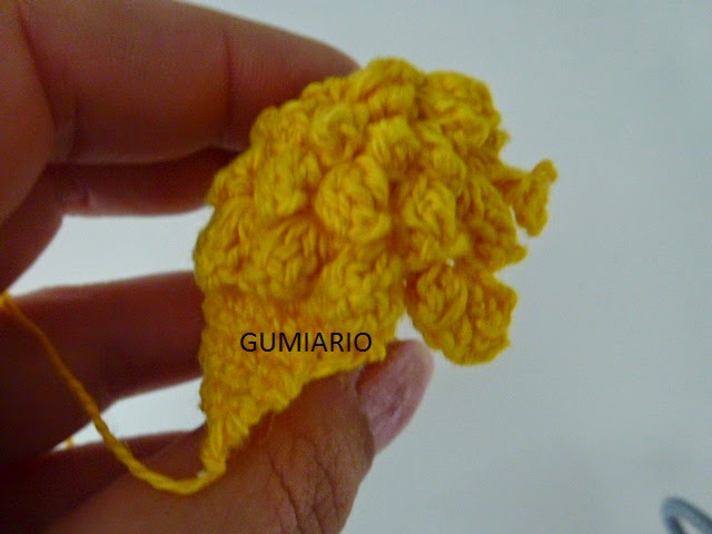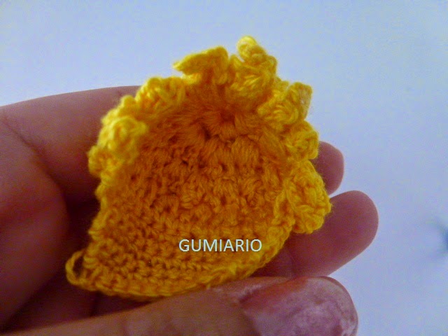 5. Damos la vuelta. Ahora iniciamos el pelo corto de la nuca. Tejemos un medio punto en el interior de cada punto pc y en cada intervalo. 17 puntos.