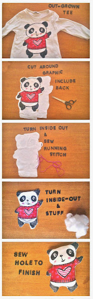 Pues he descubierto un blog, dilly foxtrot, en el que nos cuentan cómo reciclar esa camiseta y convertirla en un muñeco o peluche con el que seguro querrá dormir todos los días.