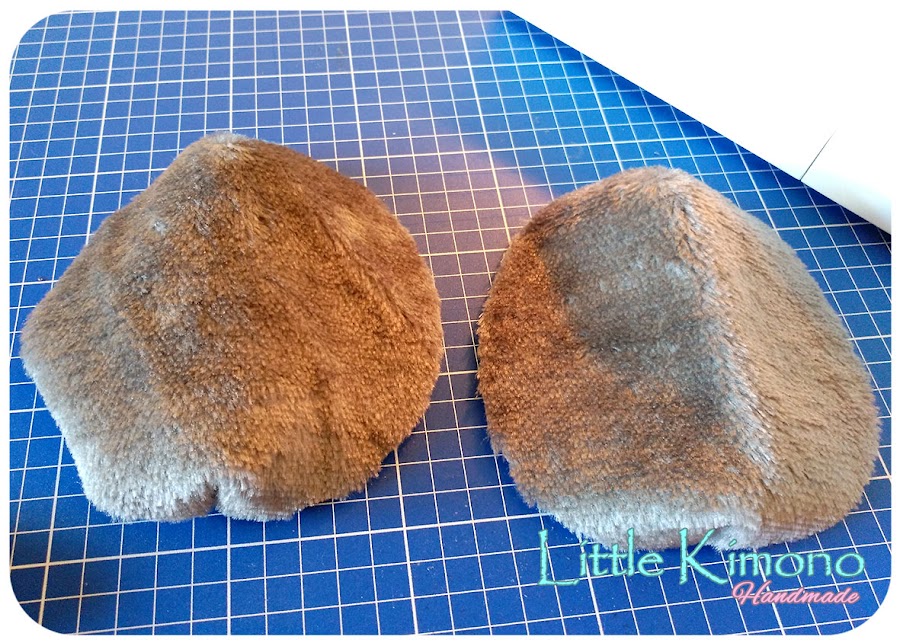 Para las orejas necesitamos una pieza trasera y una en otro color si lo deseamos para la parte frontal, cosemos ambas piezas con las telas enfrentadas.