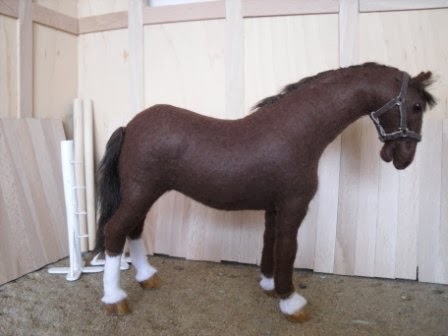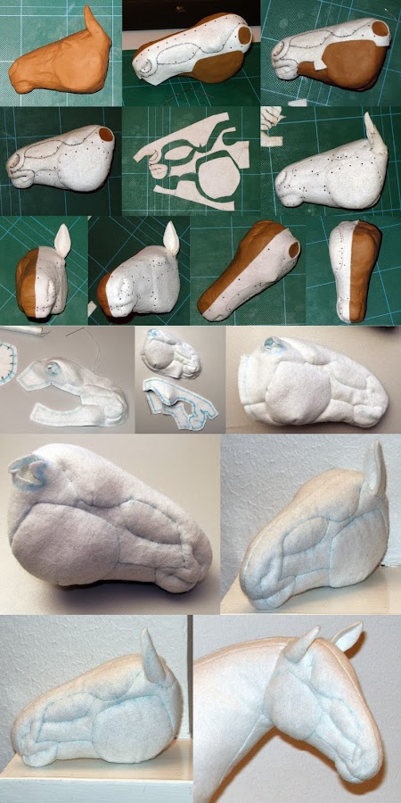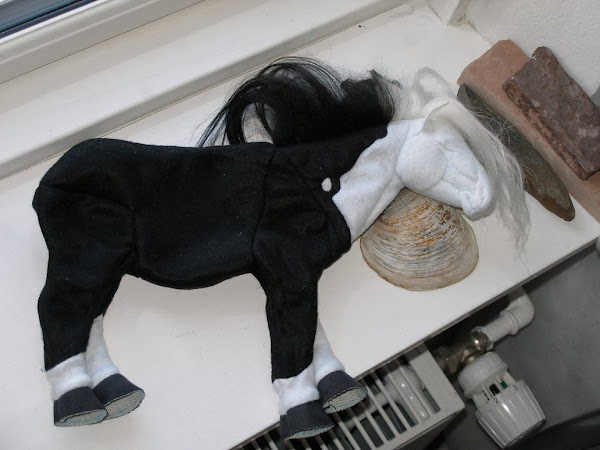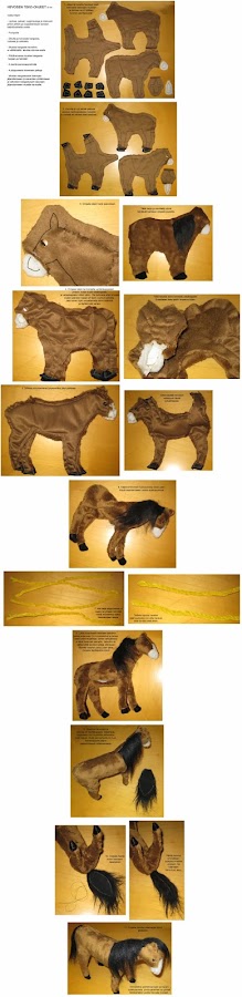 En las fotos se pueden ver diferentes tipos de formas de cabeza y cuerpos.En su morfología del cuerpo,sólo se diferencia en lo antes descrito. La cresta y la cola están hechas de hilo de algodón de seda. También lleva cascos en las pezuñas. En este caso,los ojos son botones de plástico. Los cables están sólo en las piernas.Aconsejo que si van a hacer este caballo,ponerle un esqueleto bien reforzado.El método es como en otros animales de peluche.