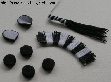 Haremos el rabo de la misma forma que la jirafa ,esta vez,en dos colores diferentes de hilo : blanco (doble) que va en la parte superior de un montón de hilos negros se hará la cola.Para ayudarnos en hacerle las crines, cogeremos una tira de cartón de unos 5 cm x 1,5 cm,en el que enrollaremos alternativamente lana fina negra y blanca ,coseremos bien con hilo negro por la línea roja y cortaremos por la parte de abajo retirando el cartón.