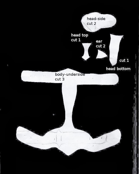 Las telas han de ser de peluche de pelo corto,por supuesto,los ojos quedan mejor de los de seguridad.( Para alargar facciones,etc...se debe de añadir los centímetros deseados por las partes que queramos hacer más anchas o largas con el margen de costura pertinente.